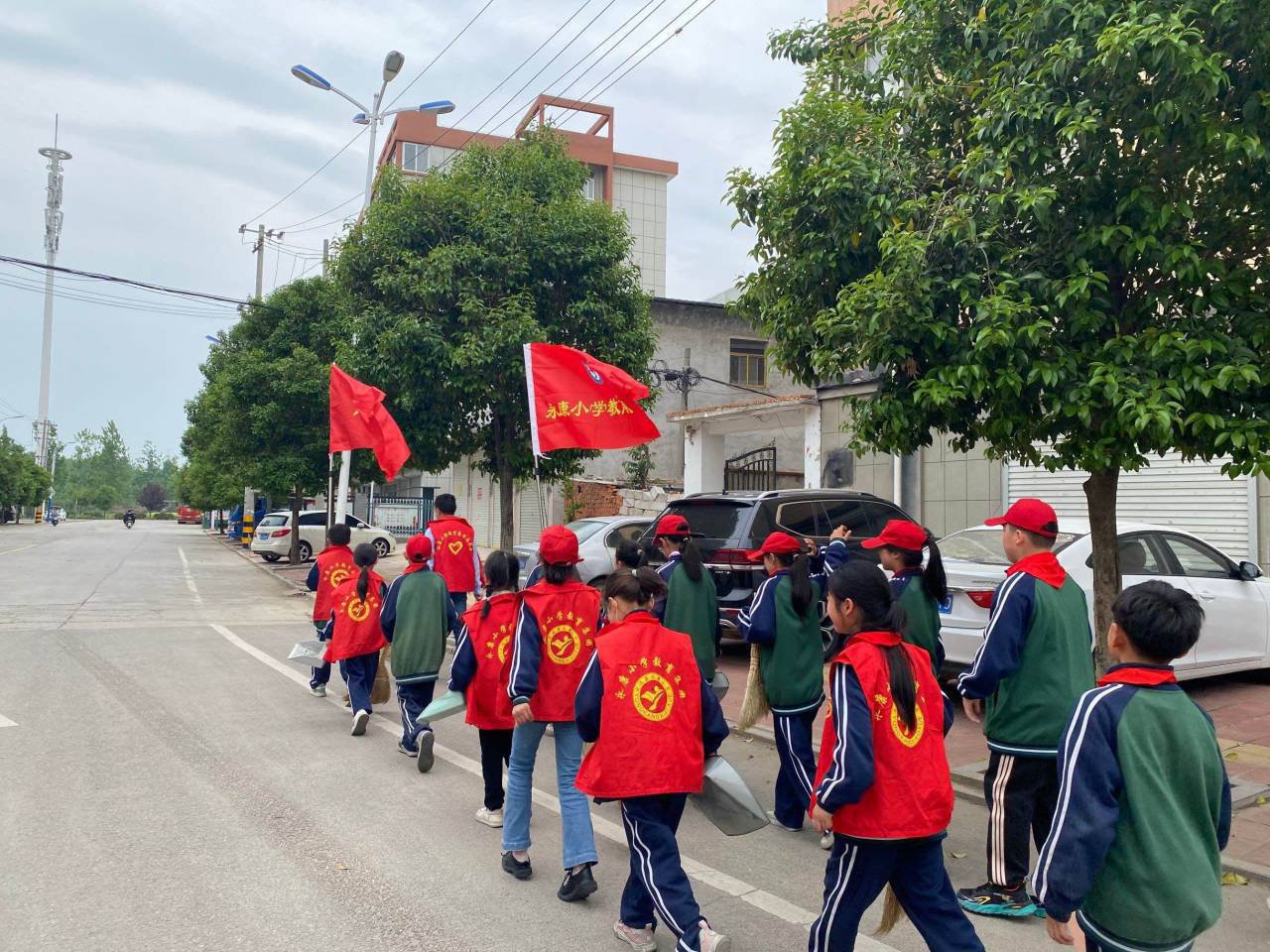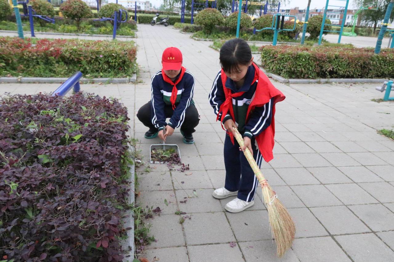 ~ 队员们在学校党支部书记、校长黄海山的带领下组成“环境整治小队”来到校园周边公园,队员们手持自带的扫帚、簸箕、垃圾桶等工具,成为公园里的靓丽风景。面对地面上的各种垃圾,队员们说干就干,道路上的烟头、废纸、等垃圾都得到及时清理,大家都不怕脏、不怕累,热情高涨,以劳动为荣。