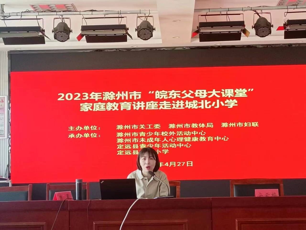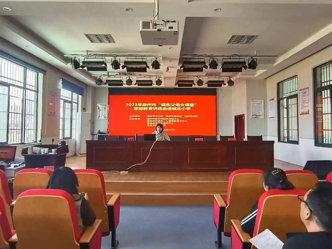 ~ 为进一步推进家庭教育工作,引导家长掌握科学的教育理念和方法,促进儿童身心健康成长。4月27日,由滁州市关工委、滁州市教体局、滁州市妇联主办的“2023年皖东父母大课堂”走进定远县城北小学,给学生家长讲授家长关于在家庭教育中相关心理学知识。县青少年活动中心安云梅、陈玉霞陪同。城北小学党支部委员、副校长尹良喜主持活动,近100名学生家长参加讲座。
