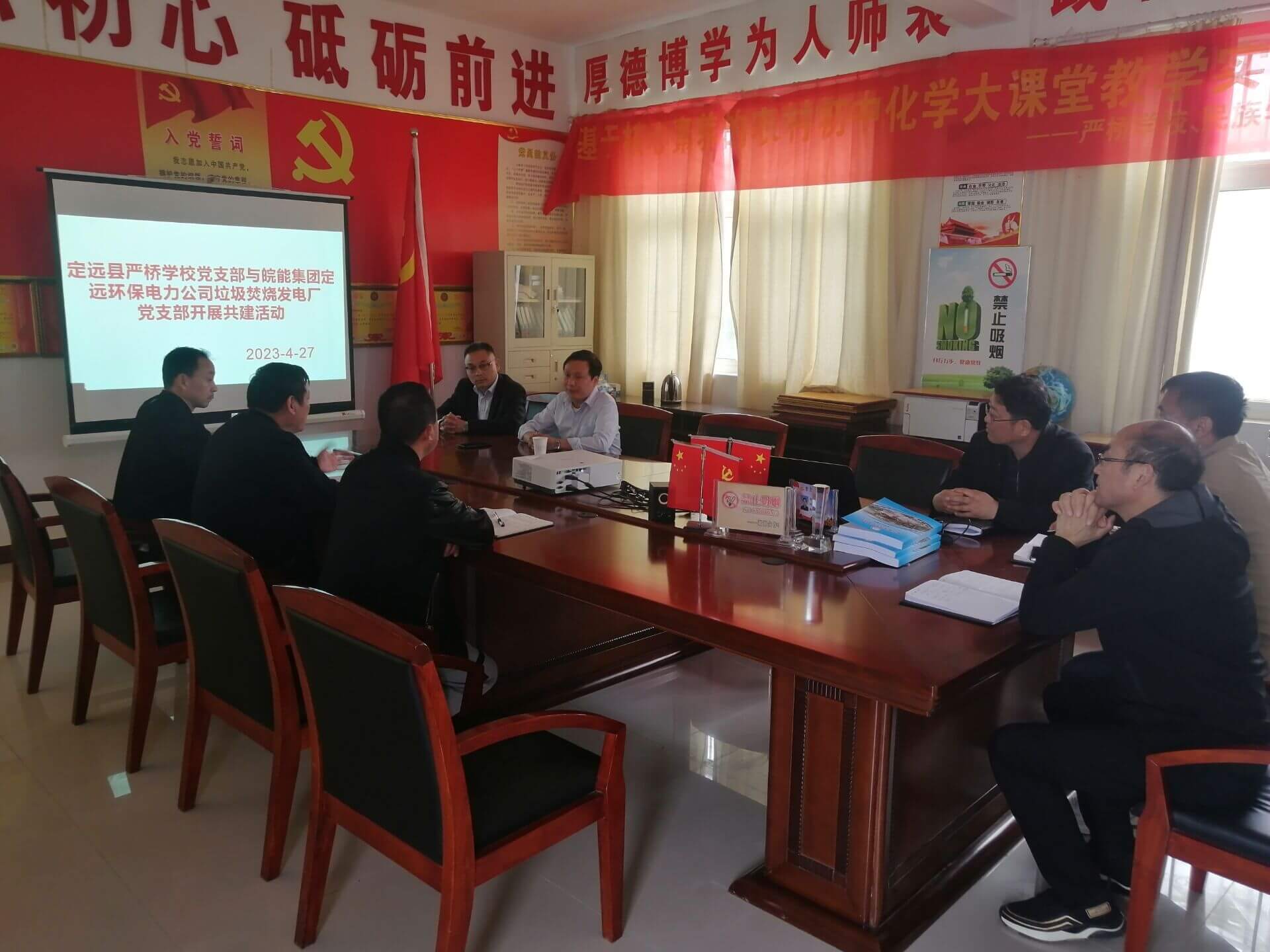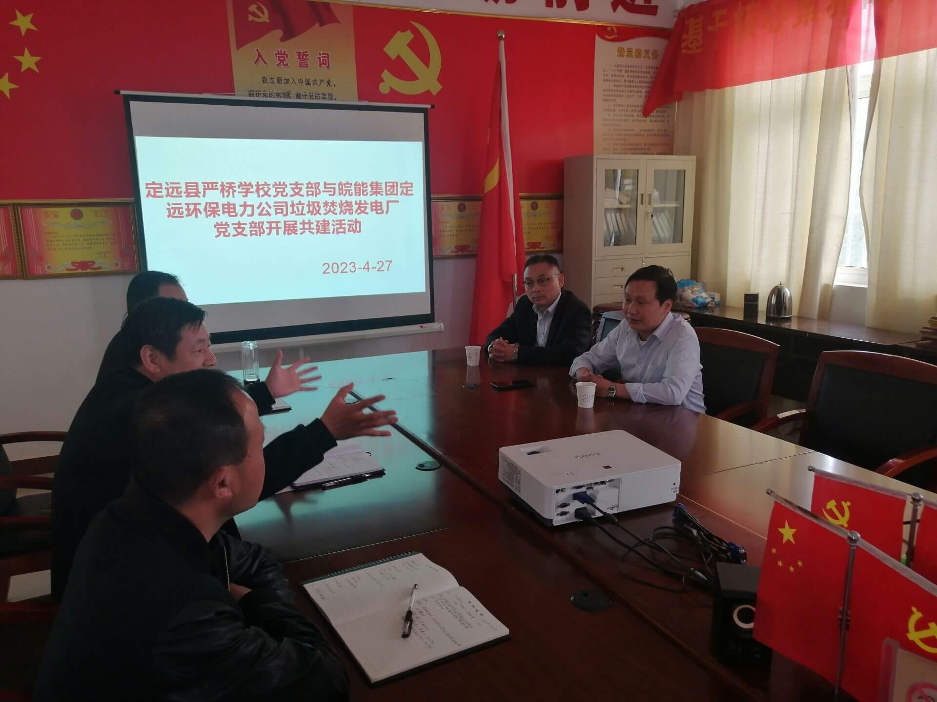 4月27日下午,定远县严桥学校与皖能环保电力公司垃圾焚烧发电厂两个党支部支部开展“党建共建促自建 同心共融促发展”共建活动。严桥学校党支部李树先书记,副书记张鹏等人与皖能环保电力公司副书记陈孝根等在严桥学校党员活动室召开党建共建座谈会,座谈会上,李树先书记介绍学校党支部建设活动及成效情况。皖能环保电力公司副书记陈孝根表示希望双方通过党建引领深化项目合作,达到共同提升的目的。参会人员紧紧围绕加强党风廉政建设等内容展开深入探讨、交流。