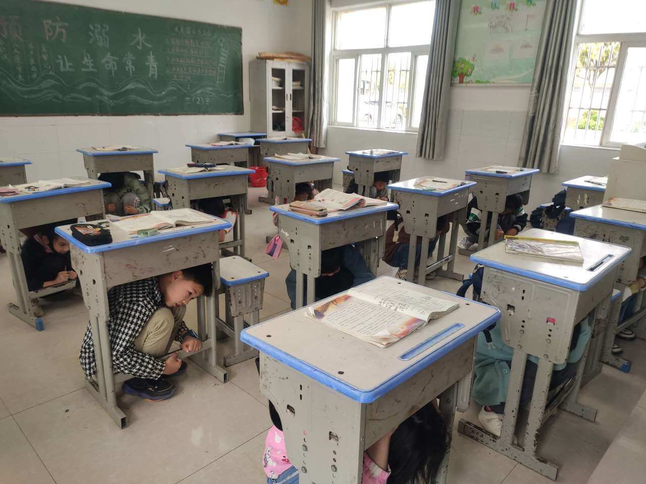~ 上午9时10分,急促刺耳的警报声突然响起,仓镇学校的全体师生迅速进入应急状态,双手抱头或用书护头藏于课桌底下,随即开始紧急疏散学生,在老师的组织引导下,所有学生双手交叉护住头部,按照逃生演练方案设定的逃生路线,快速、有序地撤离到学校操场上。随后,并有专人进行清点各班人数向安全办报告。在紧急疏散演练过程中,学生快而不乱,急而不抢,做到了安全、迅速、有序,全过程共用时2分12秒。