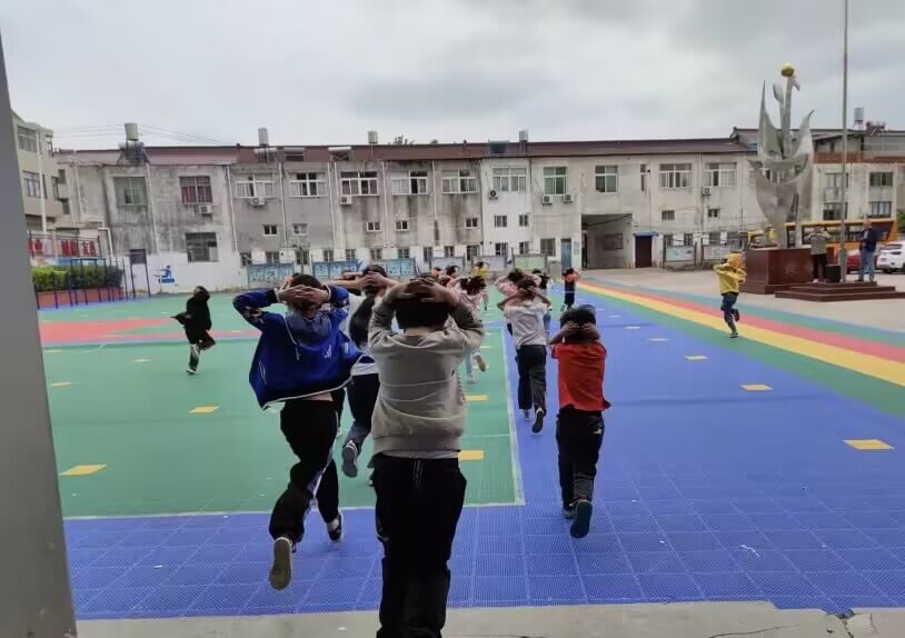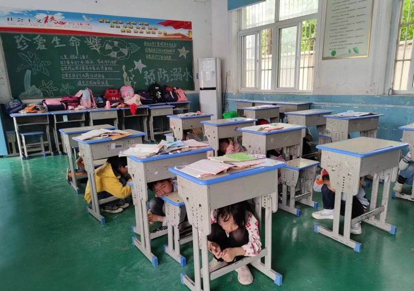 ~ “呜……”第一声地震警报声响起来了,听到警报声后老师们迅速反应,指导学生紧急避险,在老师的引导下,孩子们快速躲到就近的桌子下、墙角等安全三角区。当听到第二次警报声后,各班老师迅速带领小朋友们抱头弯腰,按照应急预案指定逃离疏散路线离开教室,有序撤离到操场安全地带。