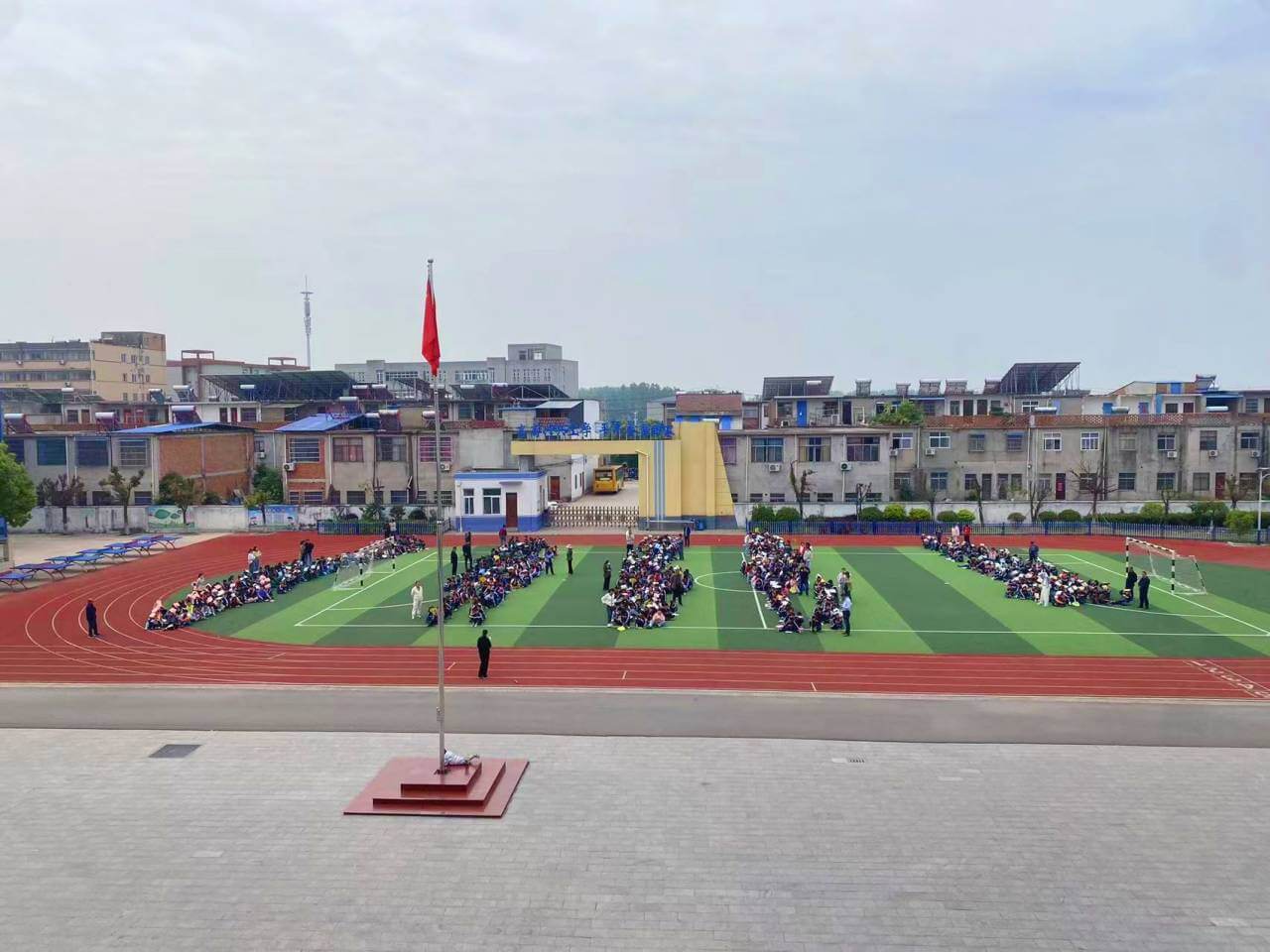 震动消失后,在广播和疏散引导小组的引导下,同学们用书本护头、弯腰低身,按照预定疏散路线有序、快速撤离到操场。