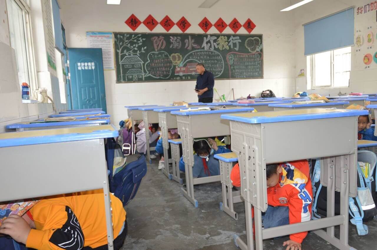 ~ 本次演练活动包括会前防震知识讲座、应急避震、疏散避险三项内容。首先,各班级召开主题班会,发放防灾减灾宣传画册,讲解防震避险相关知识。接着,听到第一声警报声响起后,同学们迅速就近躲避在课桌下或墙角处,并用手臂、书包护住头部和颈部进行避震。当第二声疏散的信号响起时,学生在老师的指挥下,双手护头颈、弯腰、迅速、有秩序地跑向学校指定开阔无建筑地带。最后,各班主任清点人数。