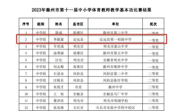 ~ 由滁州市教育科学研究院主办的“滁州市第十一届中小学体育教师教学基本功比赛”于5月5日至7日在市醉翁小学举办。来自各县市区的53名选手展开了一场为期3天的激烈角逐,定远县第一初中教育集团选派的青年骨干教师李露露老师最终脱颖而出喜获一等奖。