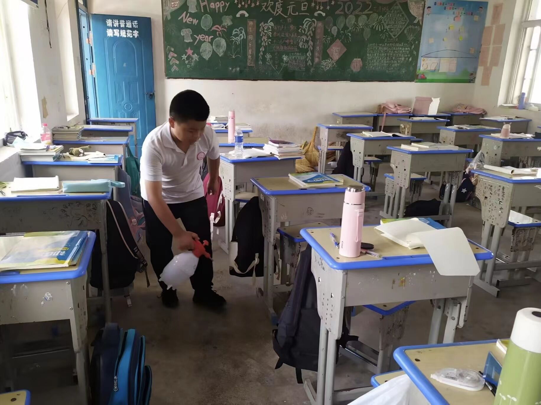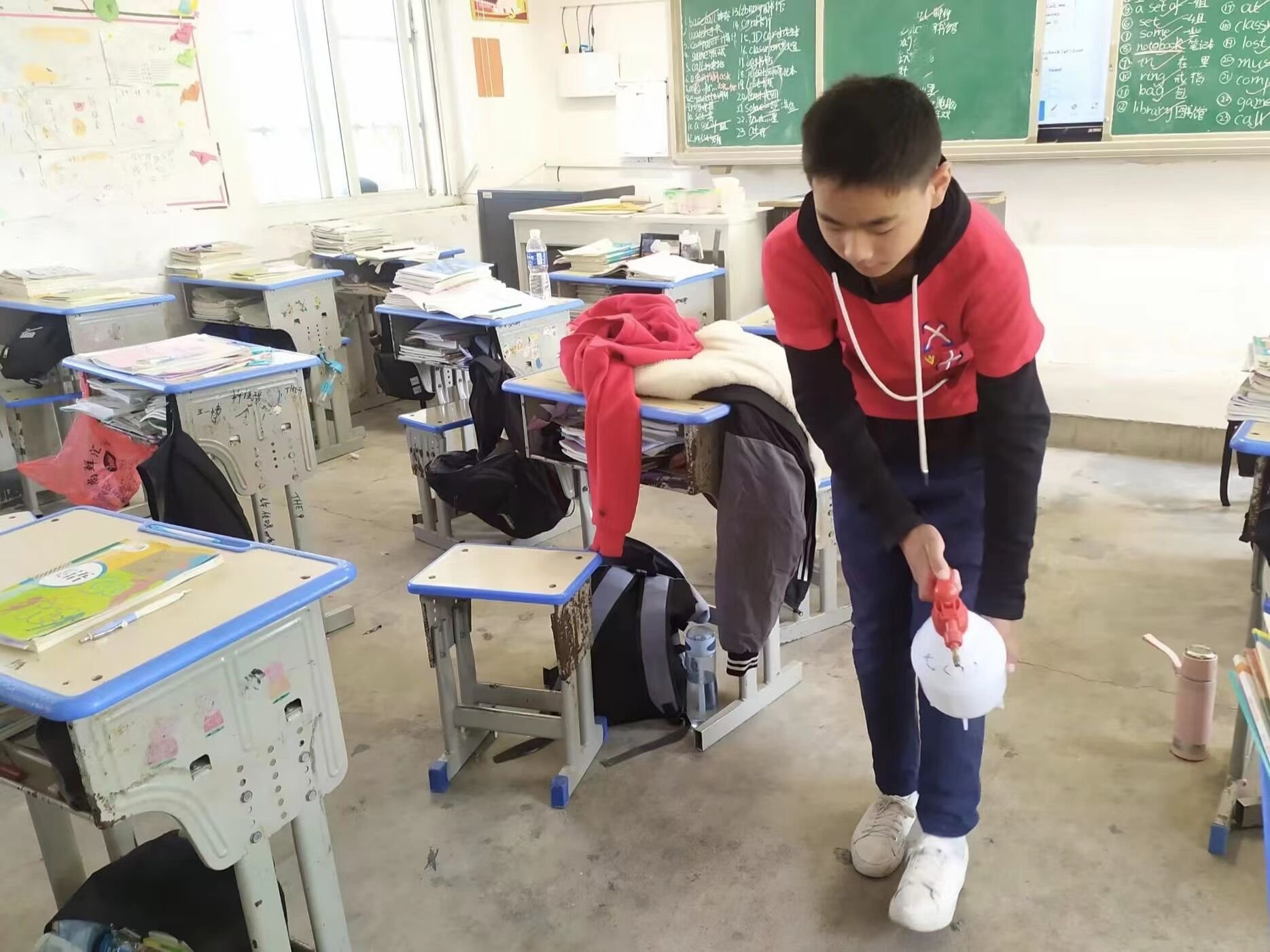 ~ 首先,师生们对教室进行了全面的清洁和消毒,对班级进行了全方位消毒杀菌。其次,老师们在消毒过程中,严格按照要求配好消毒水和清水,先用抹布把所有学生的桌椅、窗户、讲台、图书角等地方擦拭一遍,然后再将整个课室的每个角落都拖一遍,力求所有的地方都能够消毒到位。用完消毒水之后,需要关好门窗消毒30分钟,然后再用清水把刚刚擦过、拖过的地方再清洁一遍。