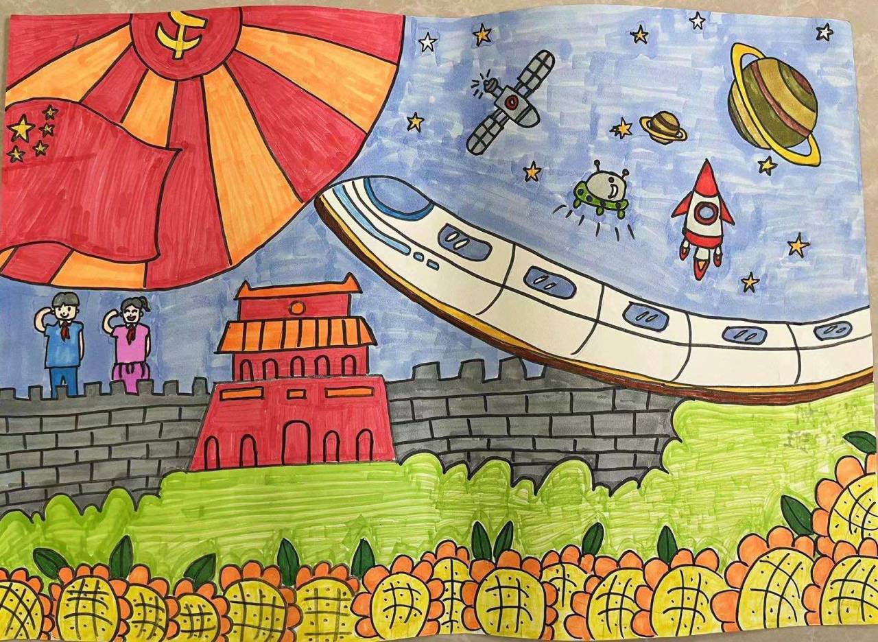 ~ 在同学们的精心创作下,此次作品中涌现出了大批高质量的画作。其中包含点赞二十大、童心向党、航天梦等多个不同视角,通过多种表现形式,以画抒怀,在点线面的勾勒中,在七色流光的色彩里倾注了同学们的真情与汗水。