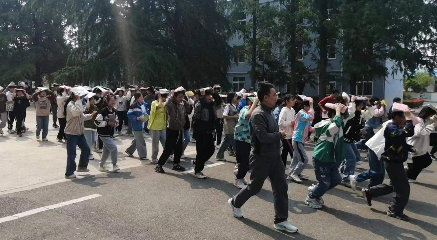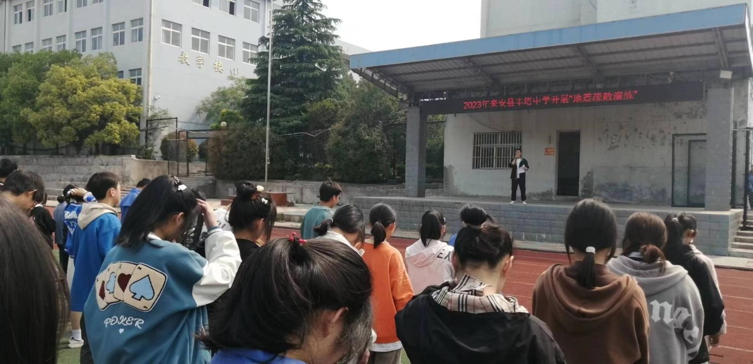 ~ 2023年5月12日9点30分,“呜—— ——”,来安县半塔中学校园内四处发出刺耳的地震预警信号声,各个楼层正在上课的400多名同学们在老师大声指挥下迅速躲避在桌底,双手拿着书包或书本护住头部;转而紧急疏散信号声响起,大家按照早已规划好的逃生路线,纷纷从教室前后门疾步而出,依旧护住头部,就近快步或小跑冲向楼梯口,有序撤离教学楼,避开高大建筑物和树木,快速到达学校操场上自己的晨会时的站位。
