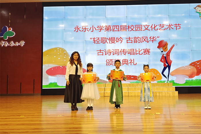~ 比赛以班级为单位,采取古诗新唱的形式,节目内容丰富,有情景剧、舞蹈、合唱、手势舞等精彩纷呈。伴随优美的旋律,比赛在一(1)班 情景剧咏鹅声中拉开了帷幕。孩子们化身为一只只雪白的天鹅,在舞台上熠熠生辉,奔向幸福的城堡;一首《明日歌》朗诵手势舞,朗诵出了孩子们的勃勃生机;《杨花落尽子规啼》合唱舞蹈中孩子们整齐划一的舞姿展现出兴欣的面貌,跳出了昂扬的精神;一首《小池》合唱唱出了儿童内心的欢悦,让我们不经想起童年飞舞的风筝和飞驰的滑轮……一首首动人的诗篇,一幕幕精彩的表演,浸染着浓浓的诗意,现场气氛热烈。同学们动听的歌声,整齐的动作,高昂的气势,既彰显了古诗词的韵律美和意境美,又展示了永乐学子积极向上的精神风貌和对中华优秀传统文化的热爱之情。比赛经过一个多小时,评委老师们认真细致地对每个节目都进行了客观、公正地评审,评出特等奖3名,一等奖4名,二等奖7名,该校党总支书记姚杰莅临现场颁奖给予鼓励。