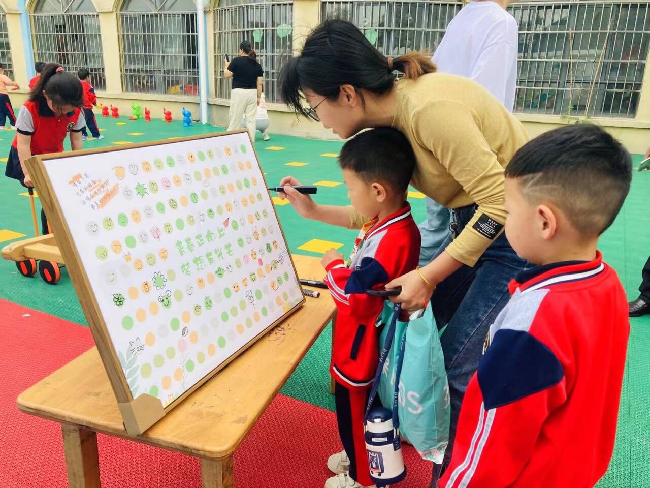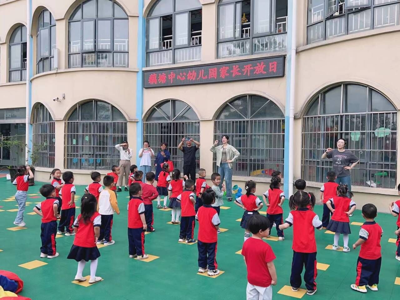 ~ 活动伊始,是入园的“自主签到”,家长随孩子们一起签到,这一细节无形中让幼儿迈出自主管理的第一步,同时帮助幼儿树立起责任感,归属感以及时间观念。在早操活动中,随着音乐声响起,孩子们个个精神抖擞,摆起动作。家长们被孩子带动,也随孩子一起锻炼起来,脸上不觉露出幸福的笑容。
