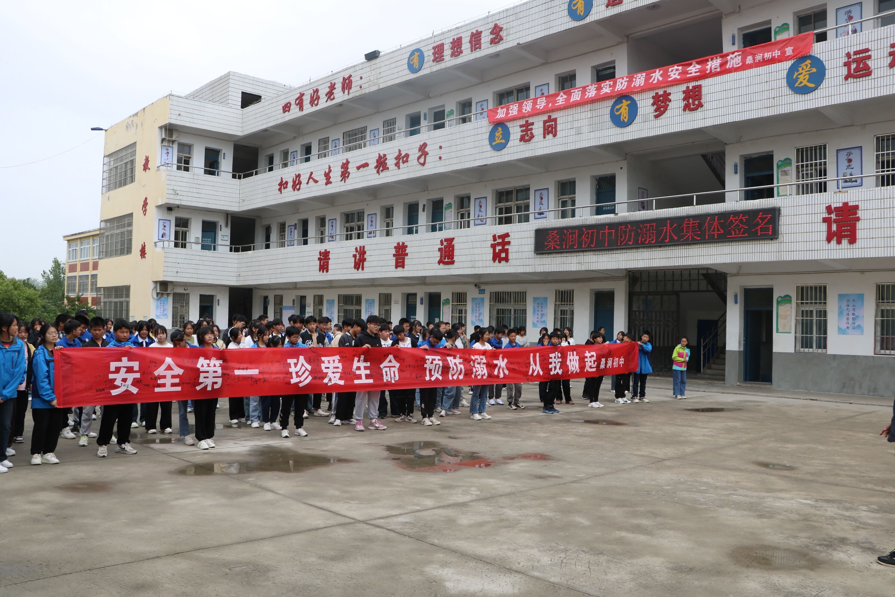 ~ 5月22日,定远县桑涧初中利用升旗仪式举行防溺水集体签名活动,强化对学生防溺水安全教育。