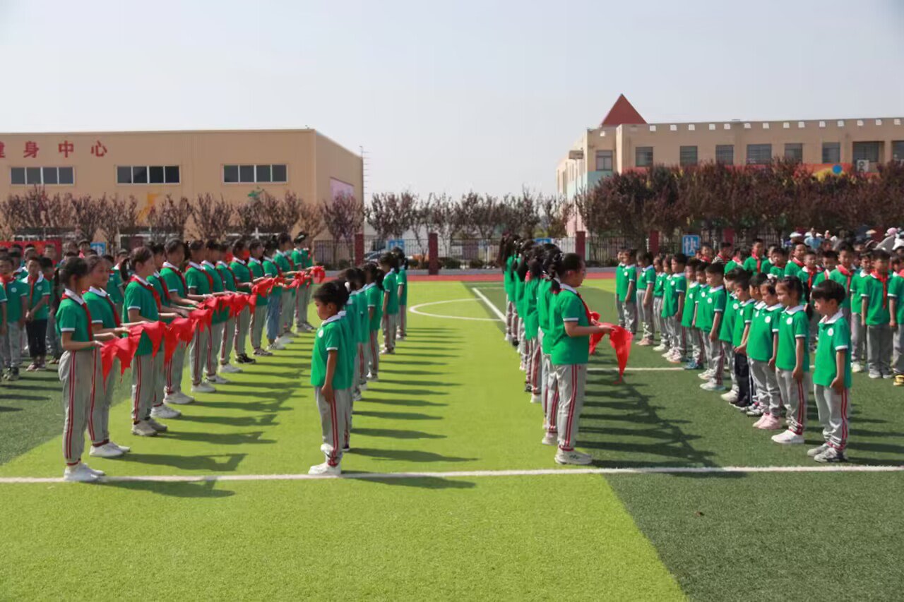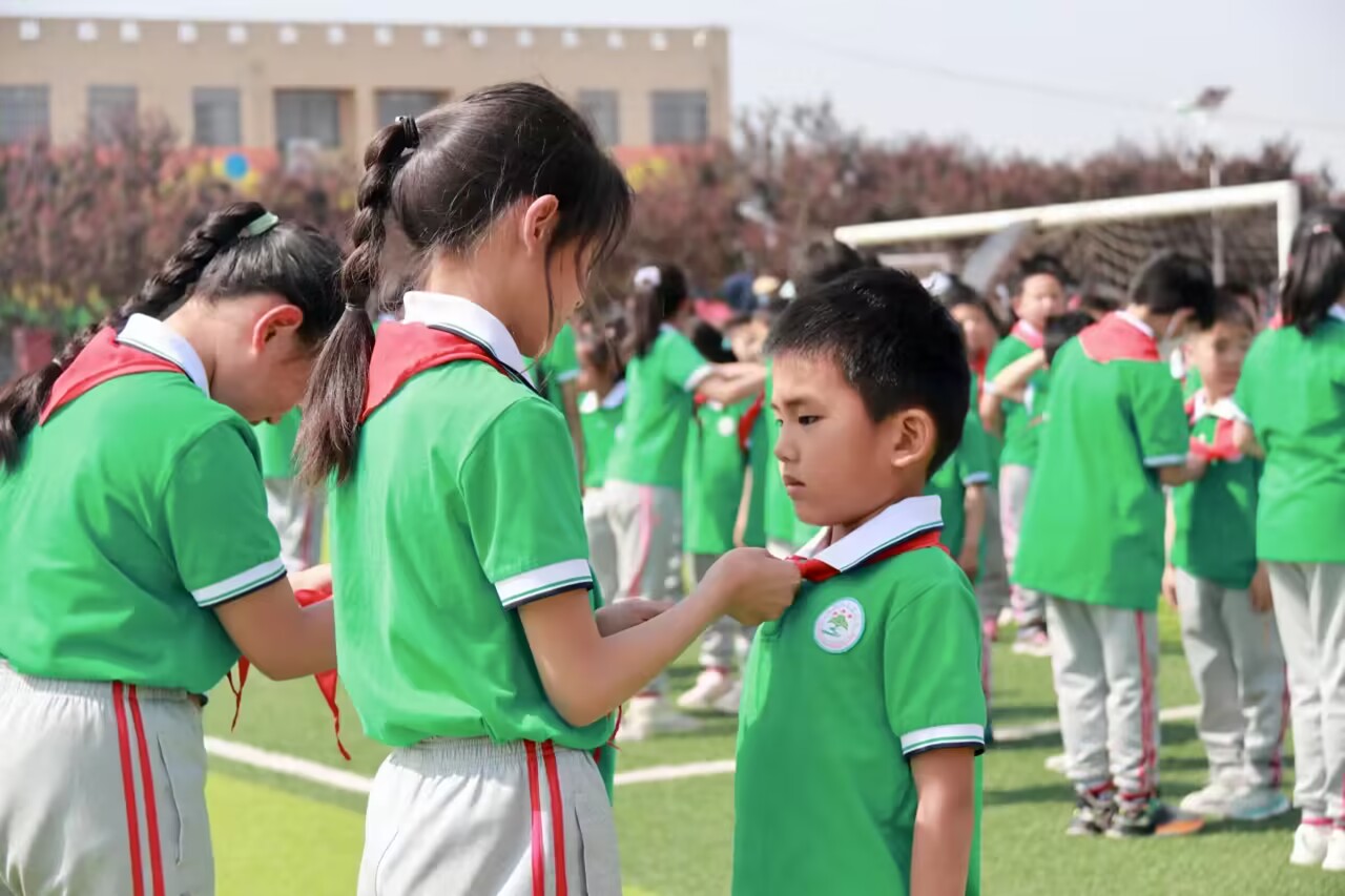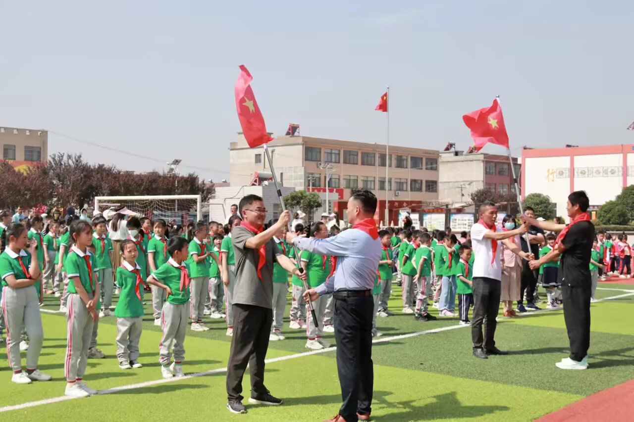 伴着雄壮有力的出旗曲,旗手和护旗手迈着整齐的步伐进入会场,升国旗,唱国歌。随后,德育主任田甜庄重的宣读了新队员名单,五年级的队员们为新队员系上鲜艳的红领巾并送上自己的祝福,新队员们回敬标准队礼。鲜艳的红领巾在新队员胸前飘扬,桑涧小学少工委主任张道胜副主任孟凡如给新建的中队授中队旗。中队辅导员接过队旗,队员们倍感光荣!