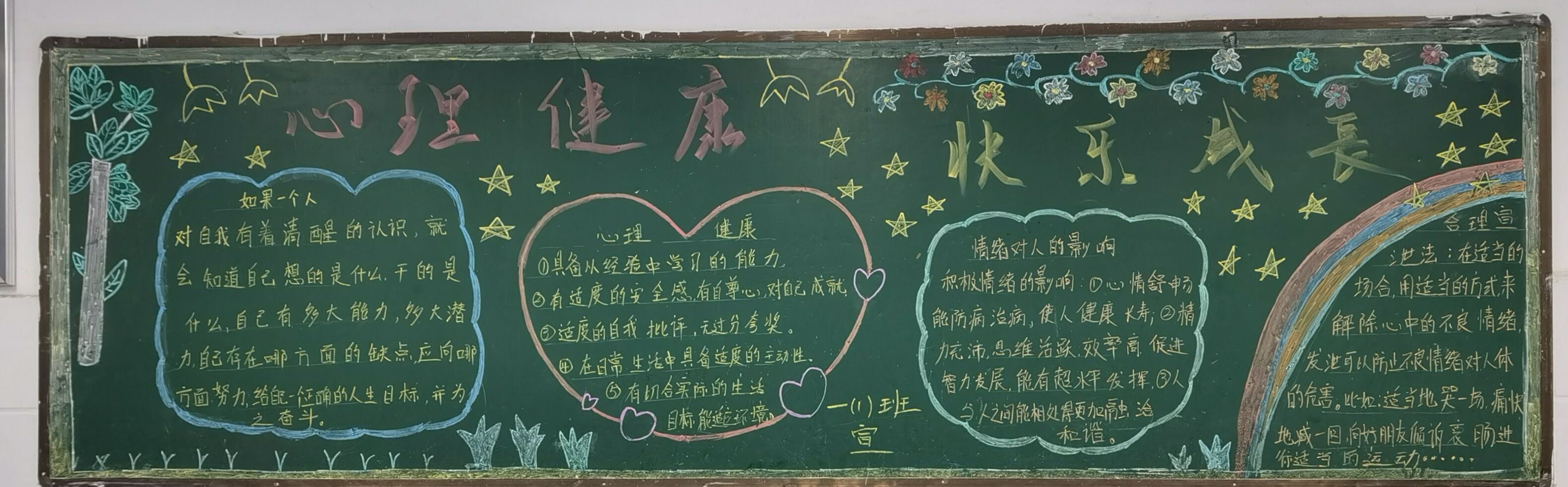 ~ 活动形式多样,内容丰富,包括心理主题班会、心理健康主题板报、个体心理咨询等。各班主任通过主题班会向学生们宣讲心理健康知识,学生们围绕主题,搜集资料,精心设计,展现出健康向上、构思新颖、画面精美的黑板报作品。该校心理咨询室也定时开放,学生可以利用课间操进行预约心理咨询。