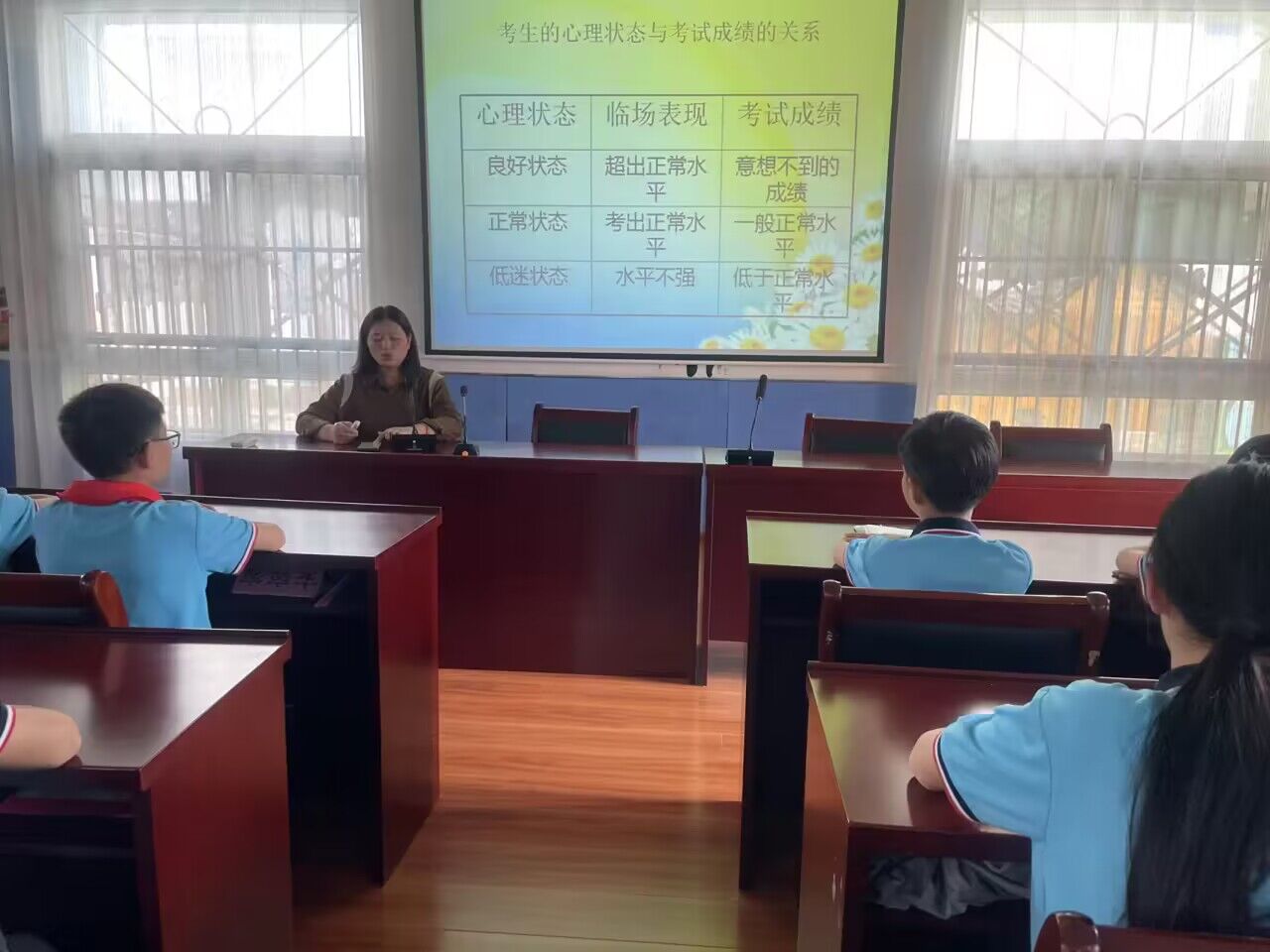 ~ 2023年5月25日,定远县花园湖小学心理健康教师杨孝娣老师和曹典翠老师为六年级学生进行“小升初心理调适”讲座,帮助学生疏导考前压力与焦虑,给予学生方法指导。