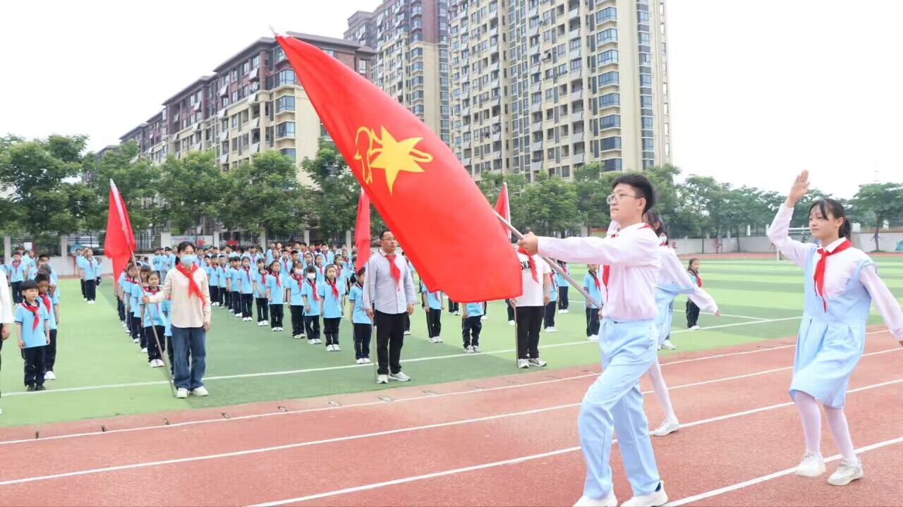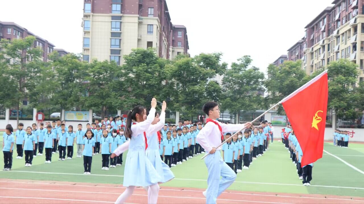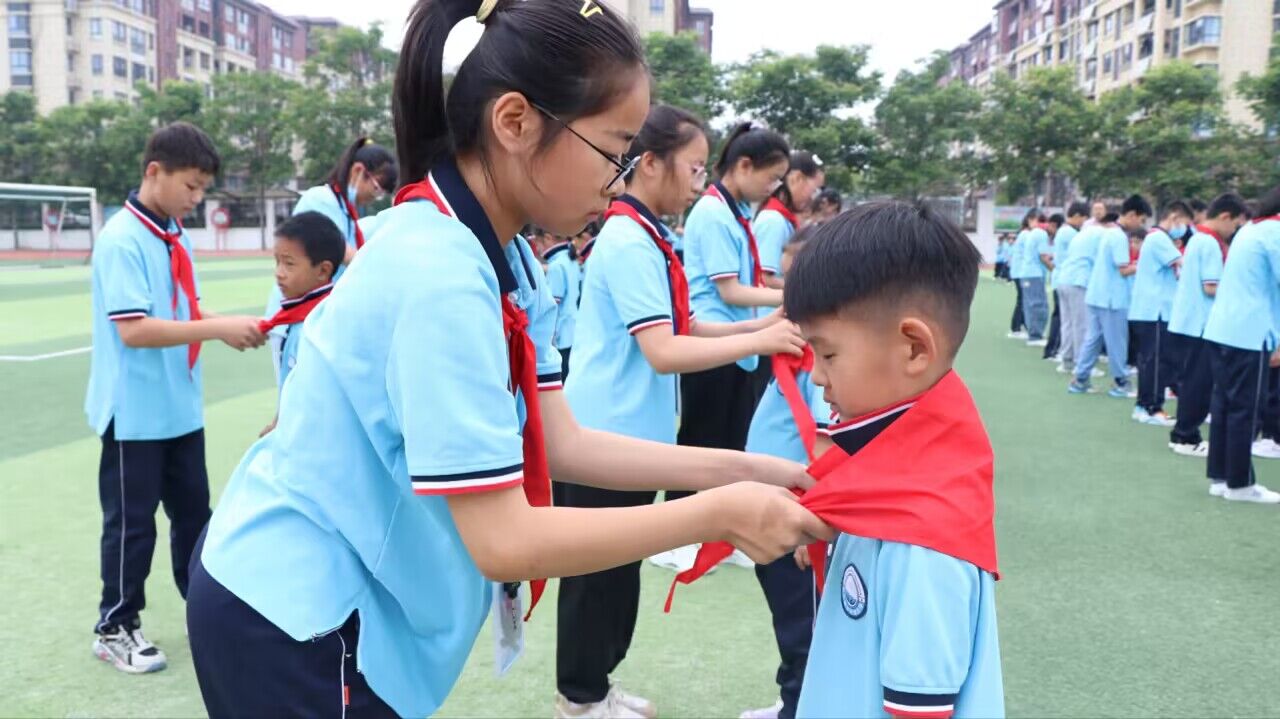 ~ 在铿锵有力的出旗曲中,旗手和护旗手迈着稳健的步伐,高举队旗入场,全场少先队员行队礼,嘹亮的乐曲激发出每位少先队员心中的骄傲与自豪。接下来大队委宣读新一轮入队名单。伴随着优美的旋律,老队员为新队员戴上他们期盼已久的红领巾。孩子们抚摸着胸前鲜艳的红领巾,脸上洋溢着开心灿烂的笑容,是那么骄傲,那么自豪。学校党支部书记、校长冯军熙对新队员提出了殷切的希望,希望孩子们争当热爱祖国、有远大理想的新时代好少年;争当勤奋学习,追求上进的新时代好少年;争当品德优良、团结友爱的新时代好少年!