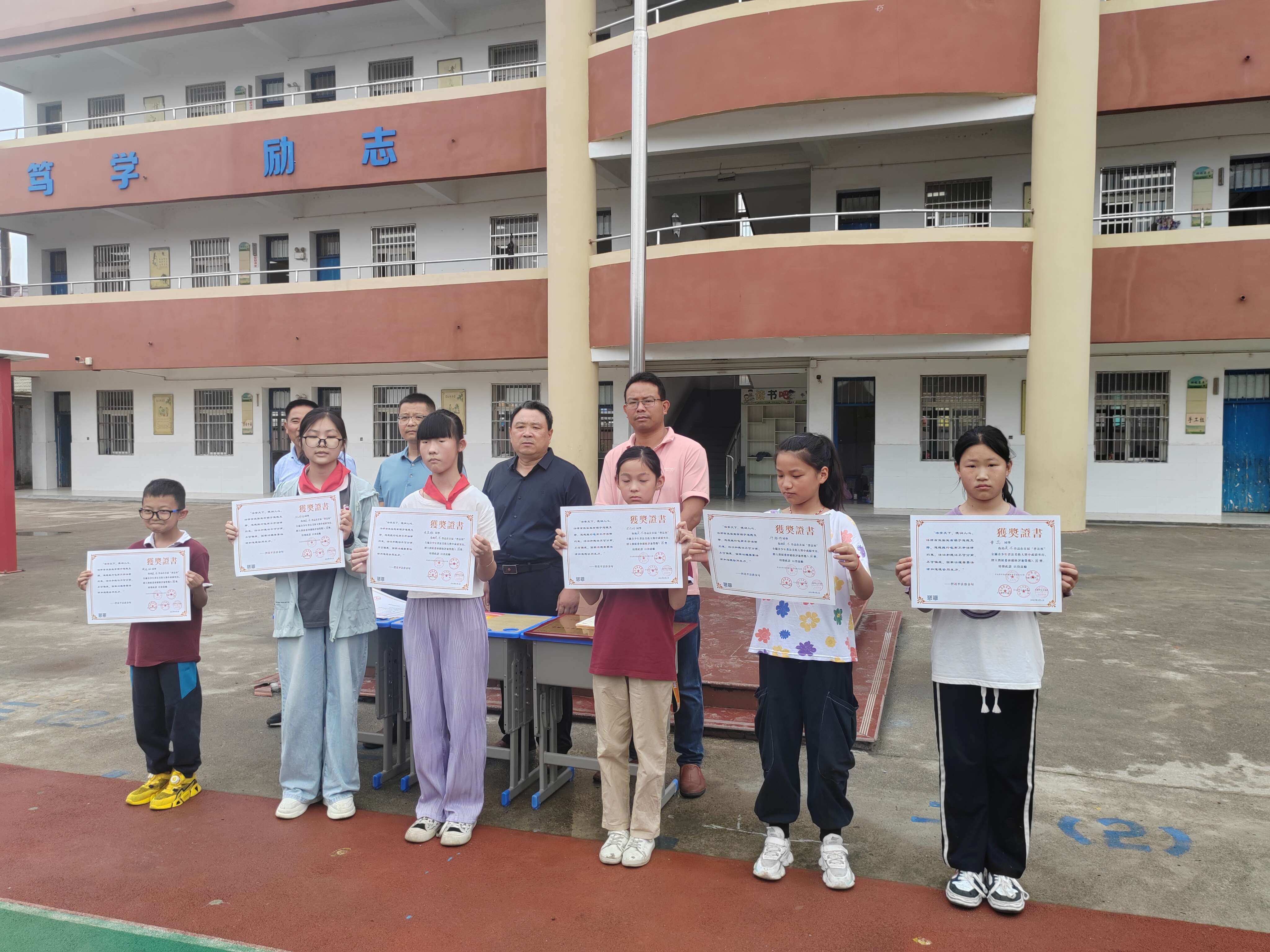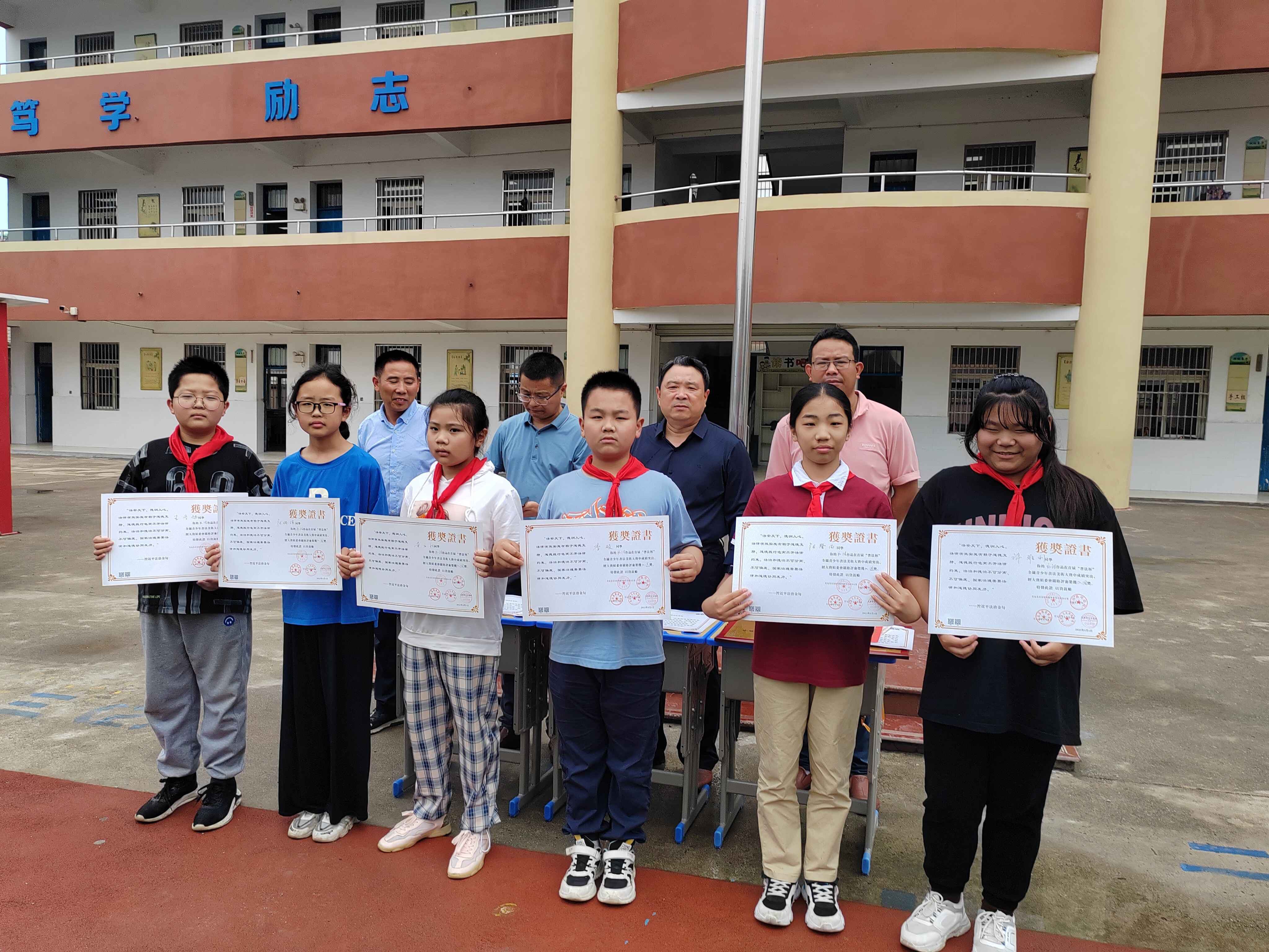 ~ 此次表彰大会由少先大队辅导员丁兆磊主持,大会首先由校长室成员为获奖的学生颁奖,并合影留念。颁奖后,陈锦武校长作了简要的讲话,希望学生们能够再接再厉,继续努力。表彰会在热烈的掌声下落下帷幕。