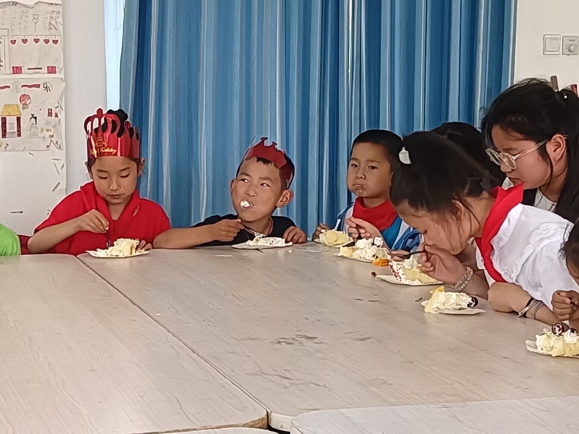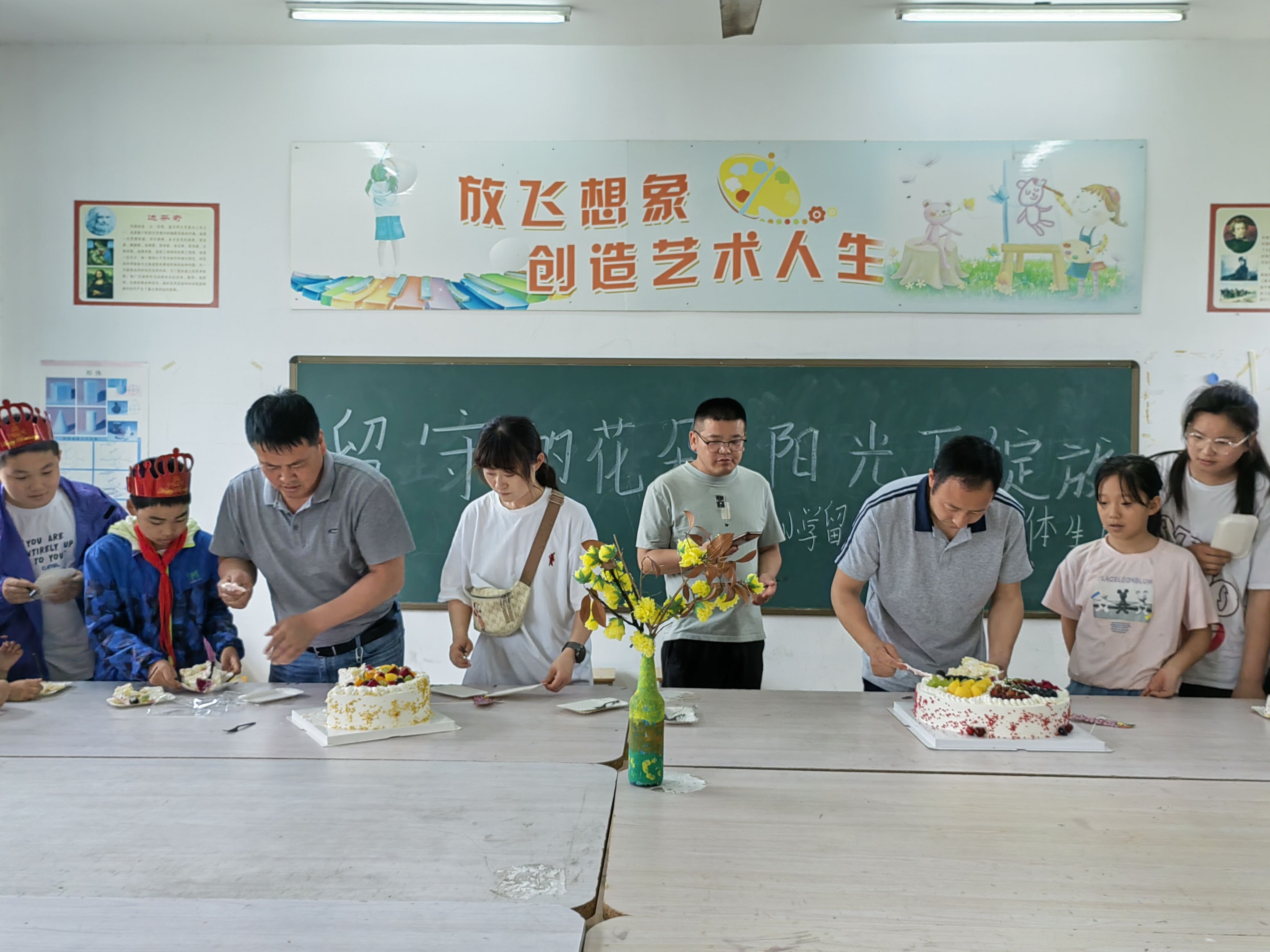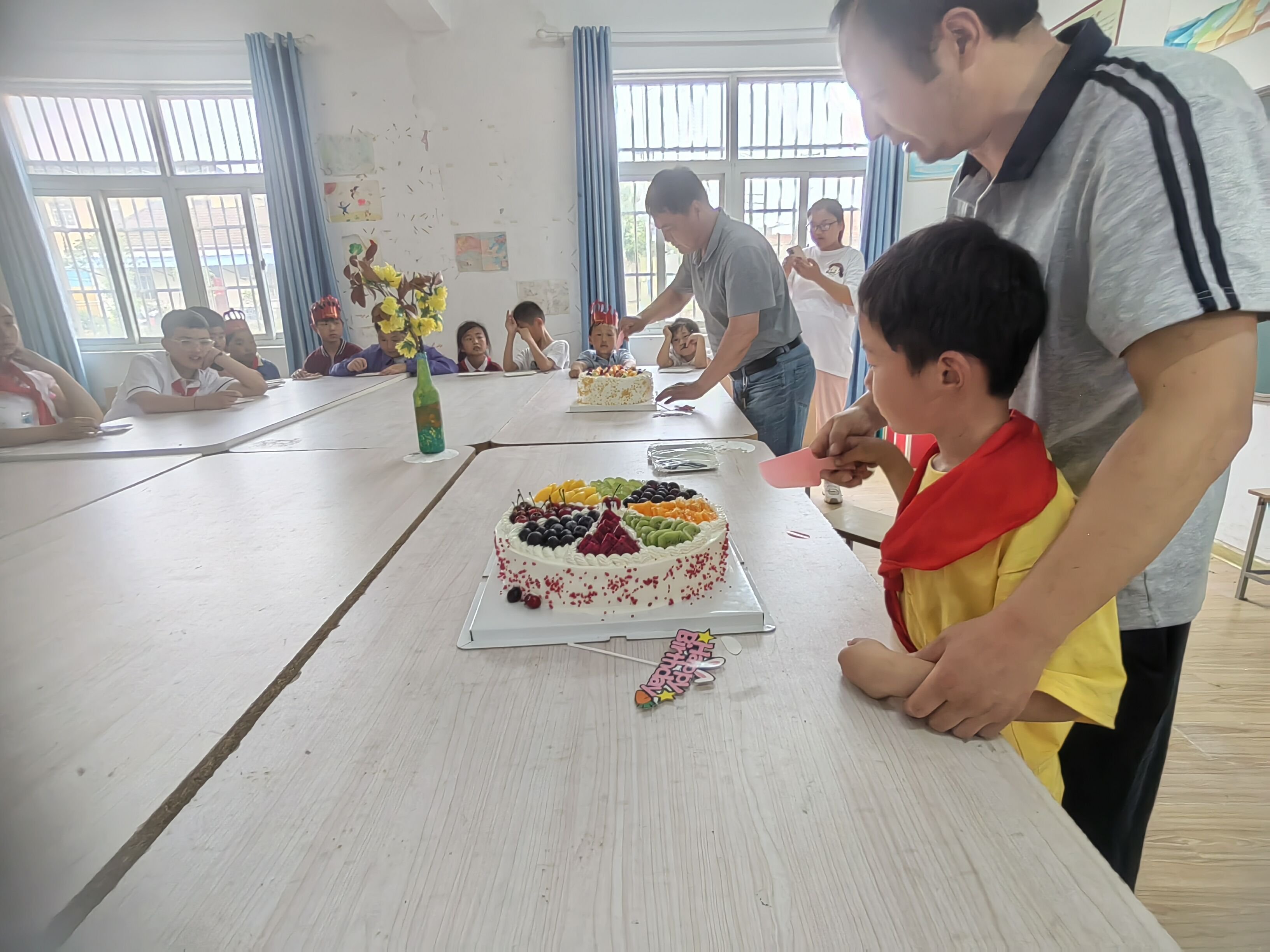 ~ 活动开始,主持人致辞。先赞扬孩子们的坚强努力,教导孩子理解父母在外的不易和艰辛,鼓励学生好好学习,成长成才。接着由老师为学生带上生日帽子。伴随着蛋糕上的生日蜡烛燃烧,欢快的生日歌响起。孩子们边拍着手边唱着歌,彼此祝福,许下愿望。最后,师生一齐切开两个大蛋糕,分享美味,共度美好的时光。