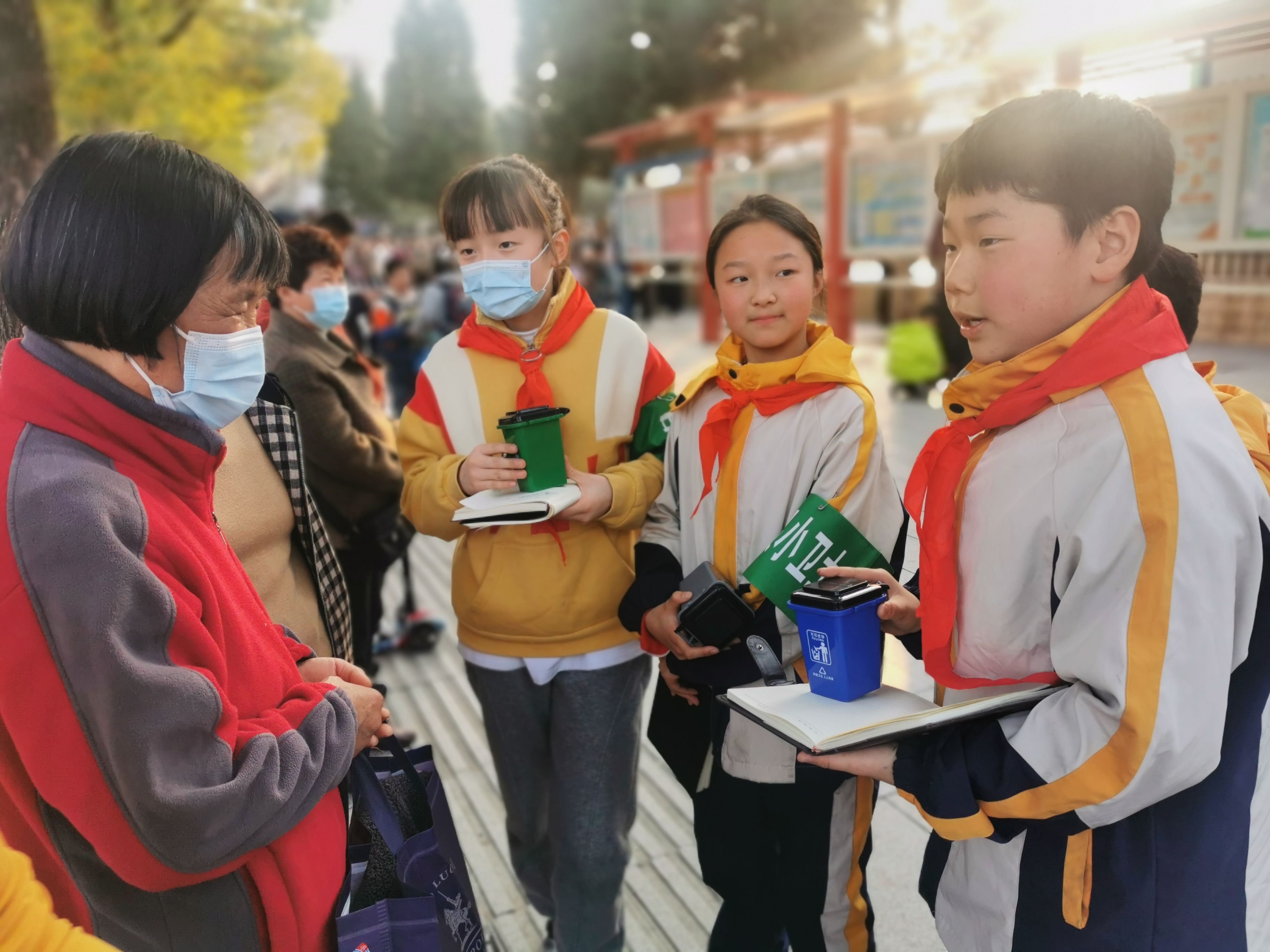 ~ 在垃圾分类活动中,队员们开展了丰富多彩的实践活动:通过上网查阅资料,召开垃圾分类主题班会,了解垃圾分类的知识;制作垃圾分类手工作品,用游戏的形式向低年级小弟妹进行宣讲;走近社区、走上街头对市民、环卫工人进行采访,了解我市垃圾分类工作的现状;课下鼓励学生身体力行地开展垃圾分类活动,先从收集可回收物开始;指导拍摄垃圾分类宣传视频,增强市民环保意识,让更多的人参与到垃圾分类中来。