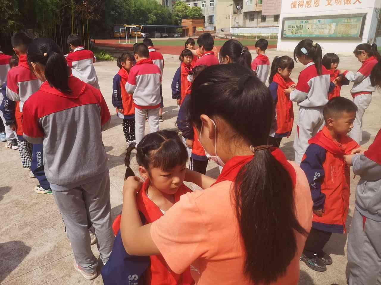 入队仪式前,大队辅导员对预备队员们进行少先队知识教育,带领学生学习少先队队史,了解少先队的成长历程,认识队徽、队旗,学习戴红领巾、敬队礼,学唱队歌……随后,五年级老队员为新队员佩戴红领巾,当鲜艳的红领巾佩戴在同学们的胸前时,一个个脸上都洋溢着难以掩饰的激动与自豪。