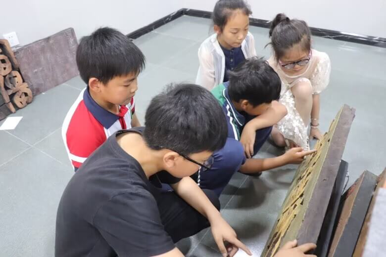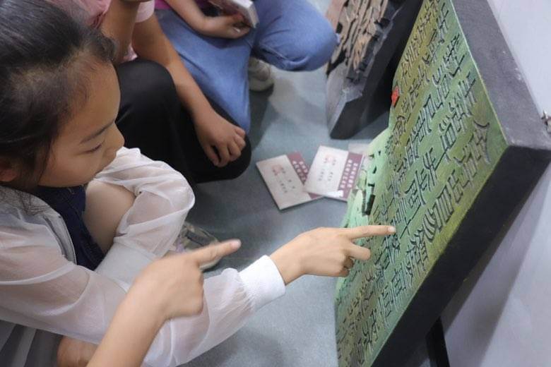 ~ 活动前,同学们通过多种方式搜集资料,了解了笔墨纸砚、汉字的演变过程、什么是书刻等相关知识。在同学们观看展览的同时,书刻家现场教学介绍了刻字的制作过程,他重点讲解书稿、上板、粗刻、精刻、上色、装饰等刻字环节。
