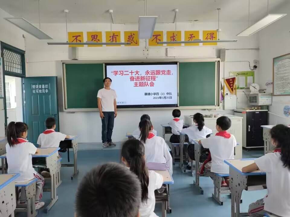 ~ 为教育少先队员感党恩、听党话、跟党走,感悟二十大精神,儿童节前夕,各班级陆续召开了主题班会。同时,少先大队还组织少先队员代表开展我与队旗合影活动,在大队辅导员的带领下,少先队员握拳宣誓,一起重温了入队誓词。