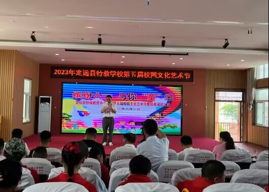 为落实“双减”政策,让特殊的孩子们度过一个愉快的“六一”国际儿童节,定远县特教学校优化课后服务,丰富师生校园文化生活,营造文明健康的校园氛围。2023年6月1日,该校在多功能厅举办了“缤纷六一 与你‘童’乐”庆“六一”活动。活动开始前,县长潘金钟在该校校长谢庆贵的陪同下对该校师生进行了亲切的慰问。活动分为三个部分,第一个部分是该校大队辅导员庆“六一”致辞,为全体学生献上了节日的祝福。