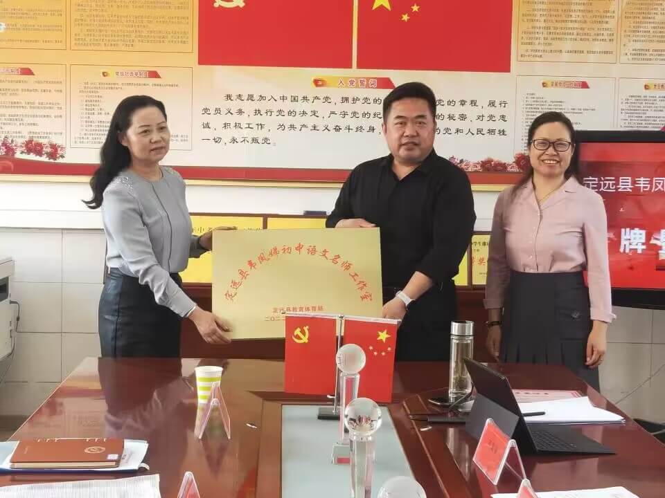为充分发挥名师工作室在教育教学改革中的示范、引领、辐射、带动作用,切实推动定远县首批名师工作室健康平稳发展,6月1日上午,定远县韦凤娣初中语文名师工作室授牌暨启动仪式在定远县炉桥中学综合楼二楼党建办举行。定远县教体局教研室主任武红,定远县教体局教研员董云艳、李秀娟,定远县炉桥中学党委书记、校长孙凯,校领导班子和工作室成员参加了仪式。柏传文主持启动仪式。