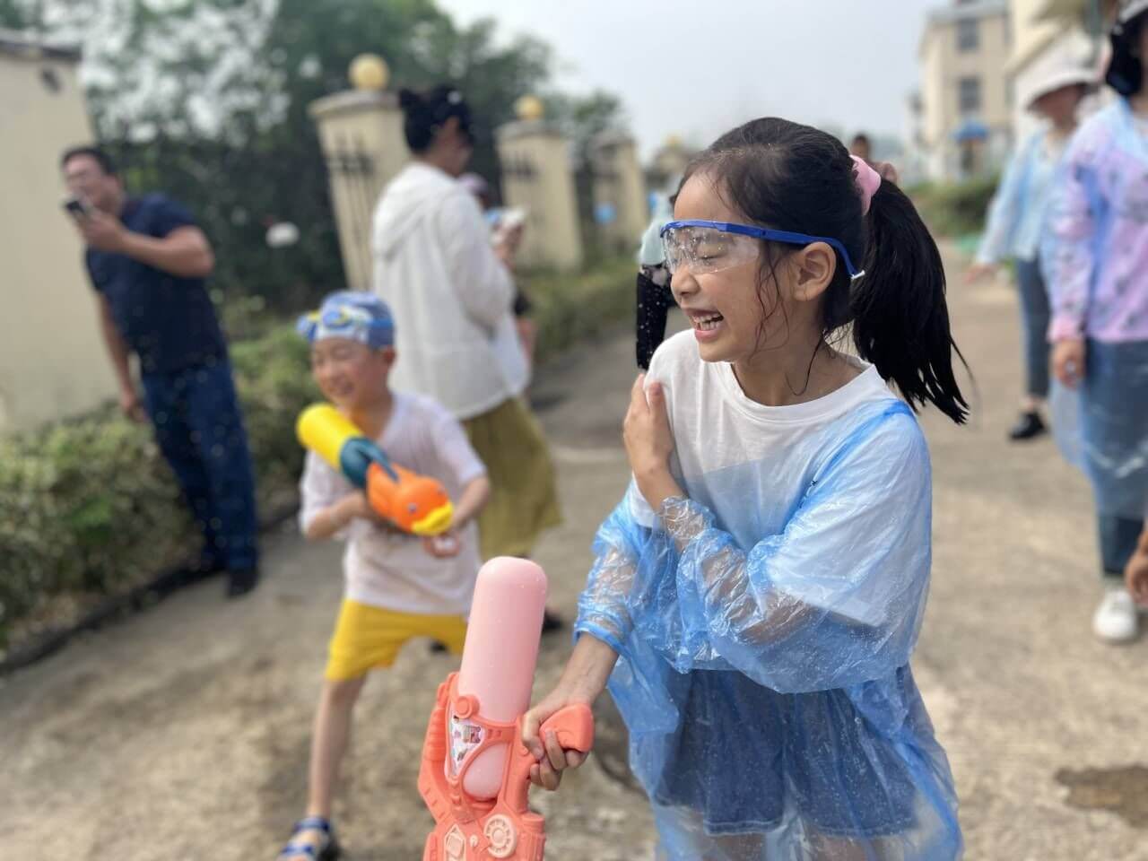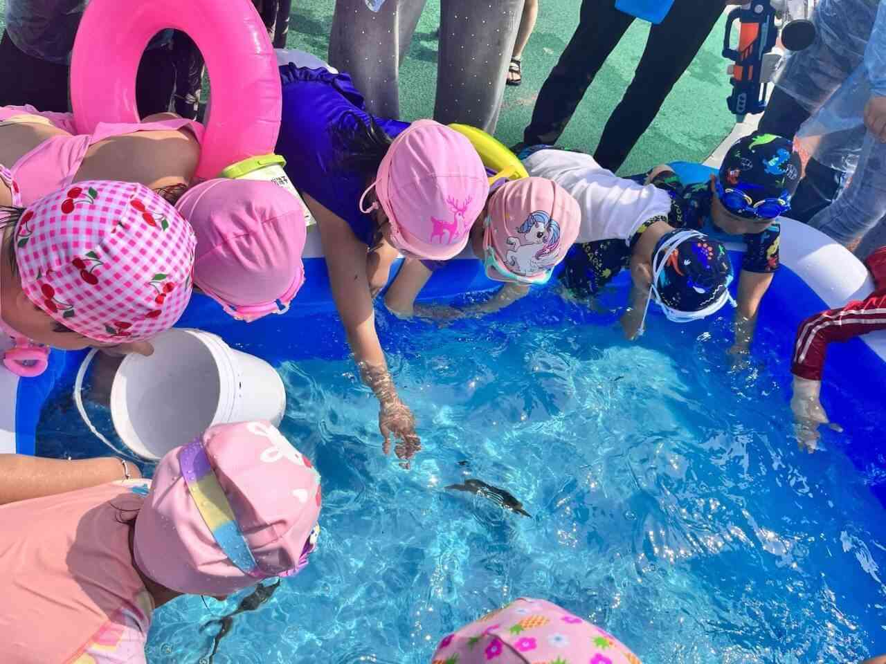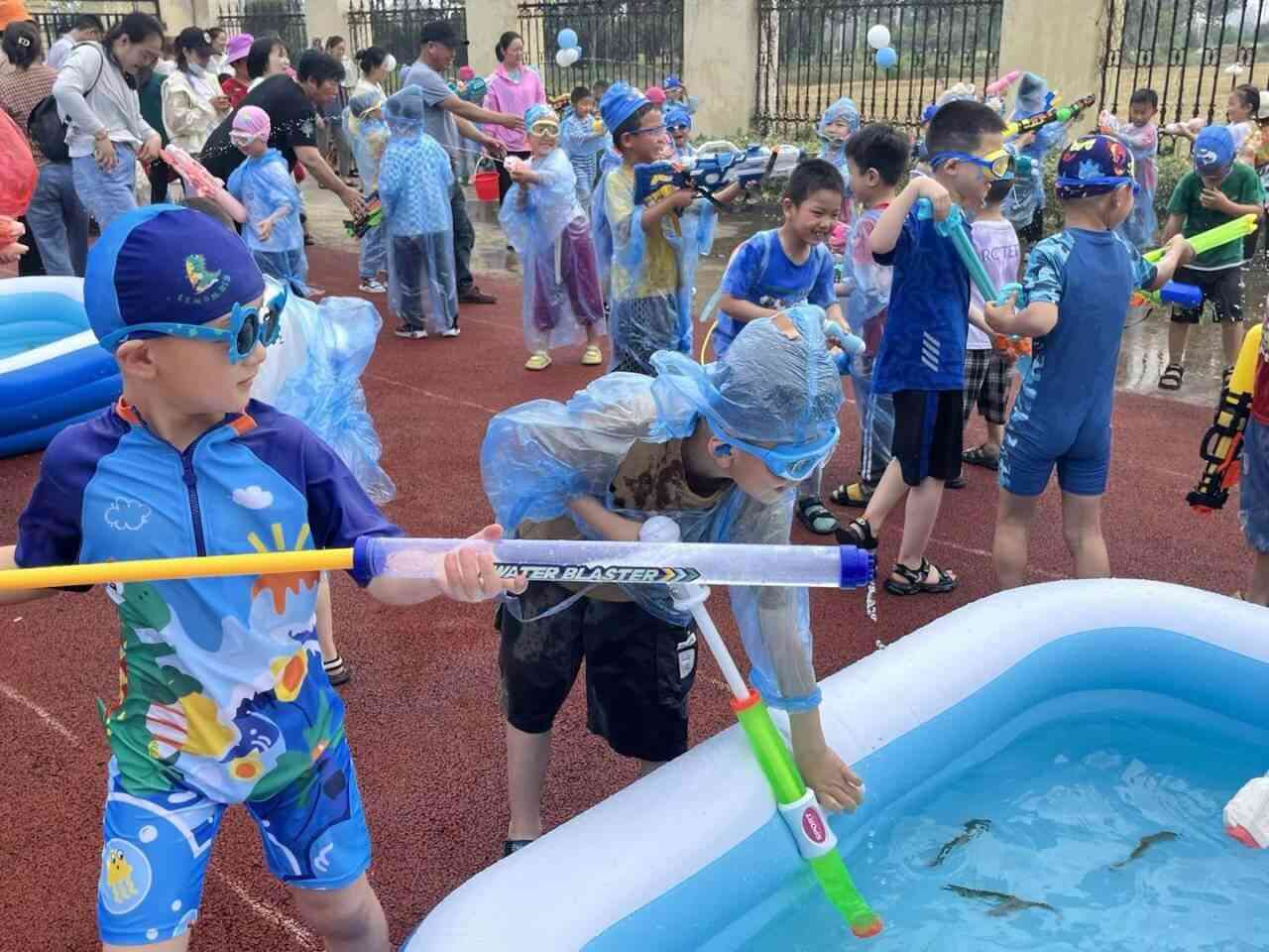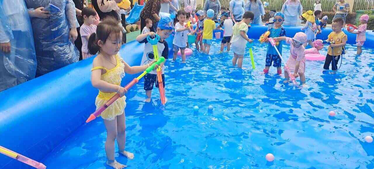 ~ 家长们早早地就来到该园门口等候,孩子们穿着各式各样好看的泳衣,背着大大小小的水枪,伴随开场音乐高兴入场。门口的签到墙成为“网红打卡地”。孩子们在专门设计的“守护战旗”、“水的搬运工”、“捉泥鳅”三个游戏中勇敢、奔跑、雀跃,大胆点的孩子直接跃入水池,享受水带来的凉爽,也有孩子为捉不到“狡猾”的泥鳅而气愤不已……玩水活动结束后,每个孩子都领到了幼儿园精心准备的“六一礼物。”