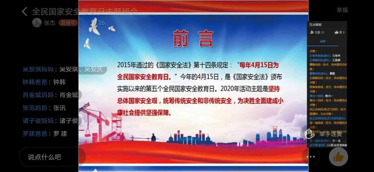 根据学校统一部署,九年级召开主题教育班会,七八年级班主任组织线上主题班会。学生们通过观看图片和视频资料等形式,了解了《中华人民共和国国家安全法》等法律法规,并统一收看了《2020年全国中小学生国家安全教育专题片》。