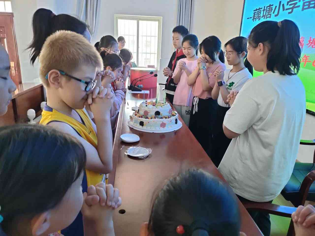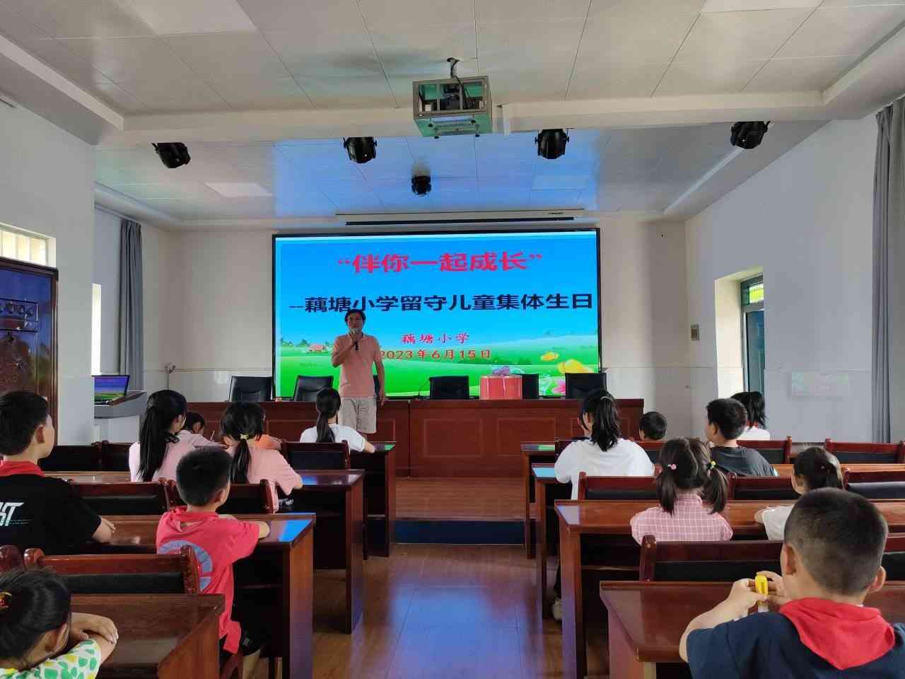 ~ 6月15日中午,定远县藕塘小学全体留守儿童欢聚一堂,一起庆祝“集体生日”。本次活动由留守儿童之家管理员李伟伟主持。