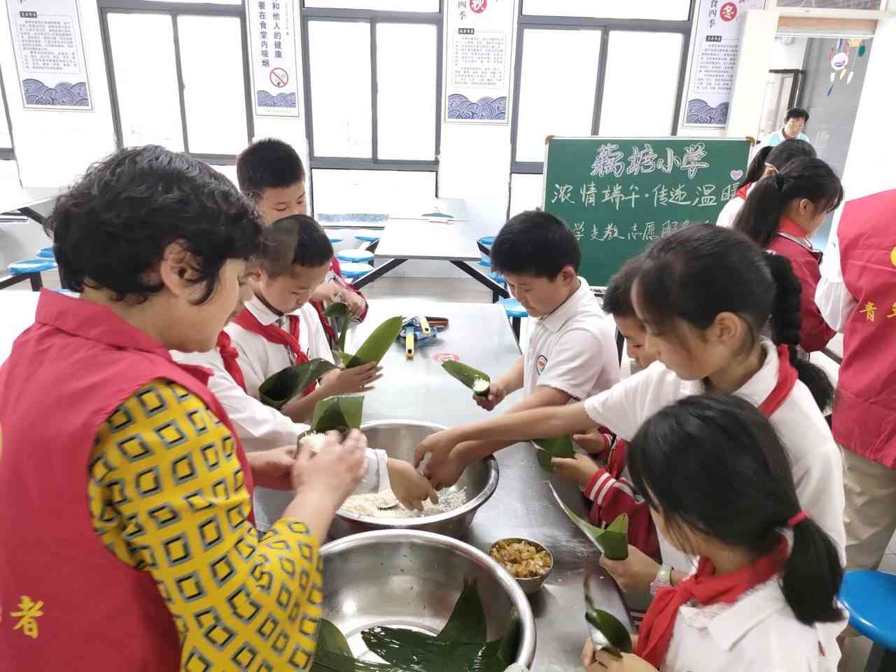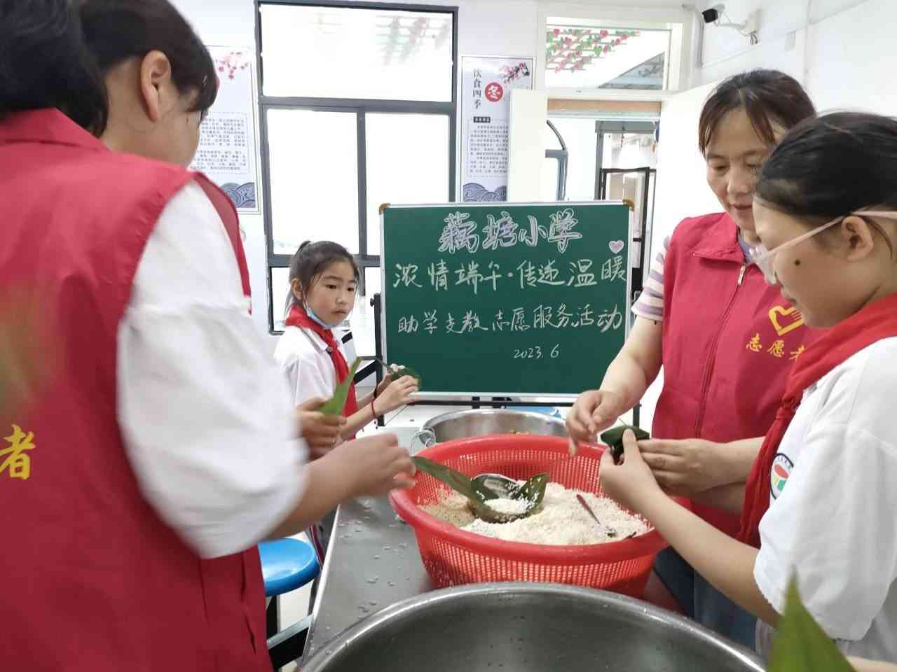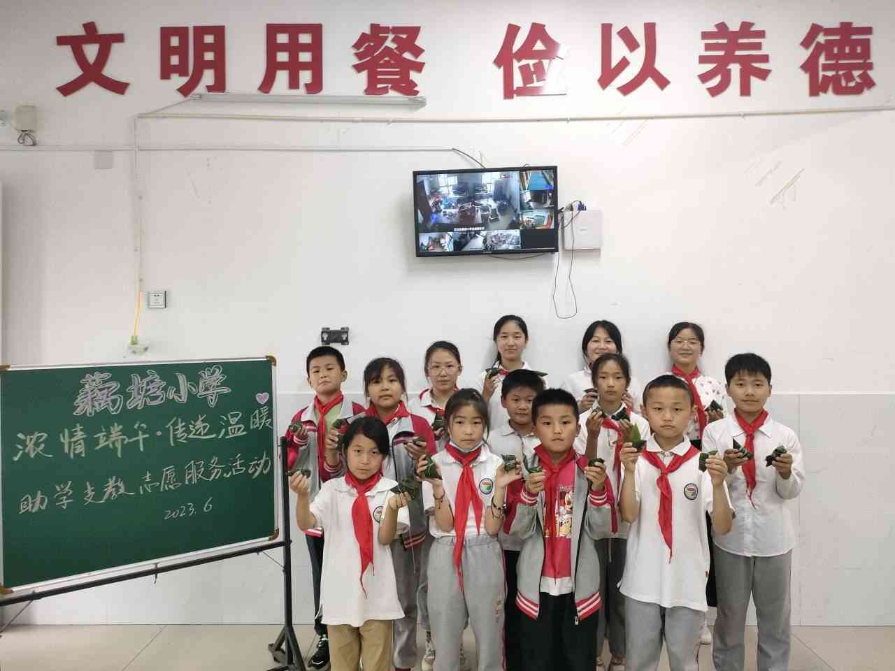 ~ 端午节来临之际,为了让留守儿童在集体的温暖中度过传统节日,增进师生之间的亲密联系和相互交流,6月19日中午,定远县藕塘小学组织全体留守儿童在食堂开展了以“浓情端午,传递温暖”为主题的爱心助学志愿服务活动。本次活动由留守儿童之家管理员主持,该校部分志愿者老师也参加了活动。