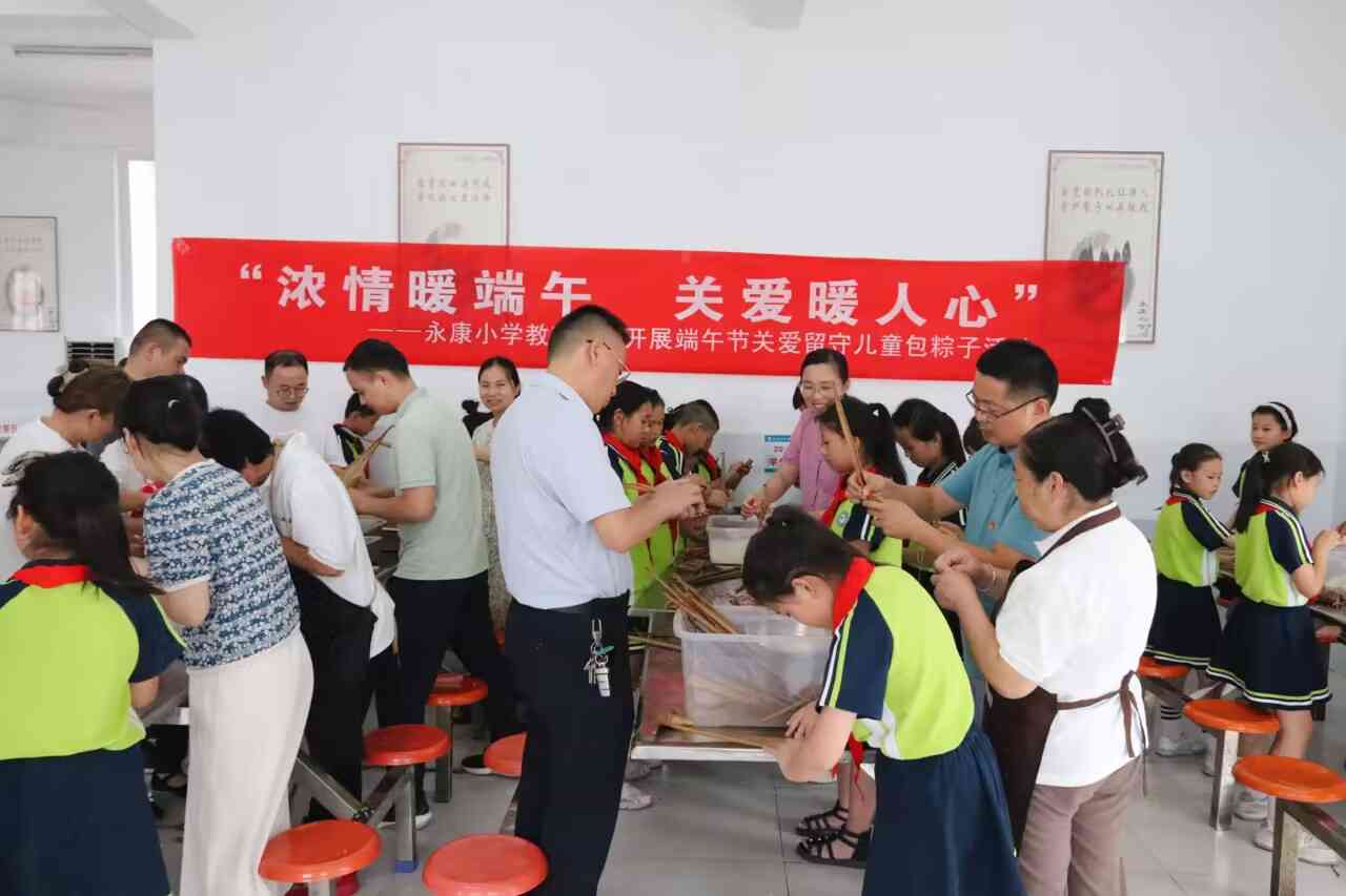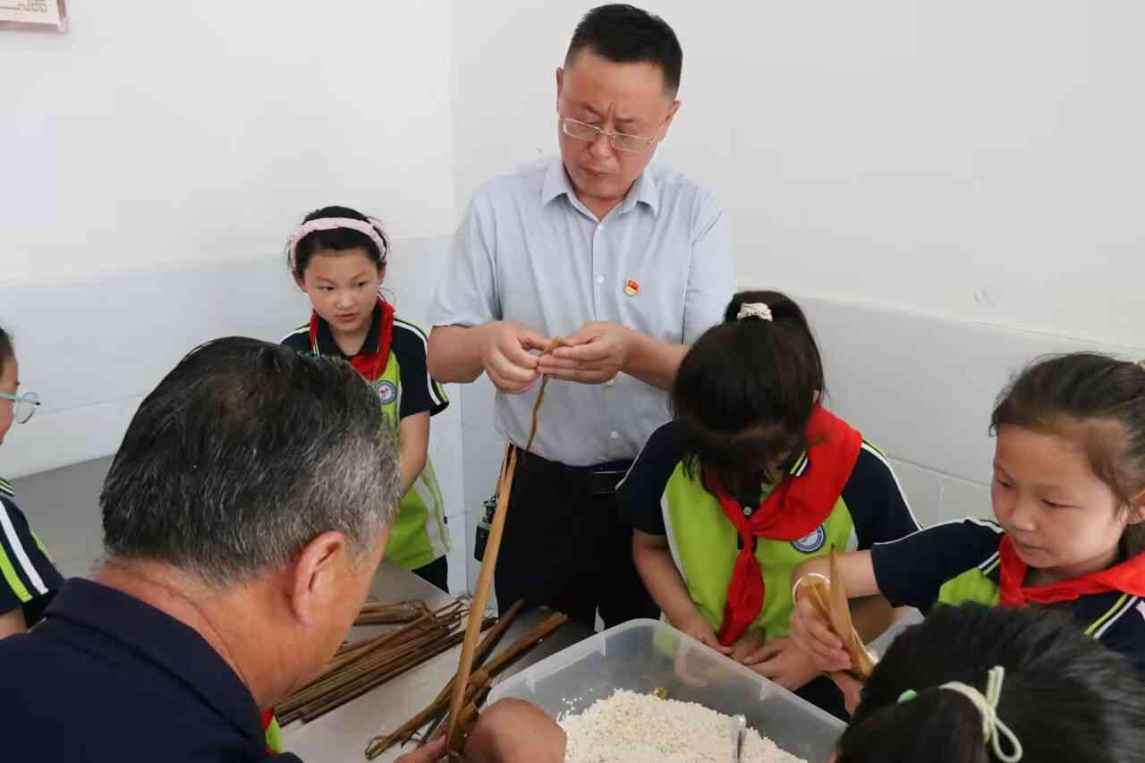 ~ 活动以主题班会、端午手工制作、挂香囊、包粽子等丰富多样的形式引导同学们感受传统文化魅力,进一步培养了学生以爱国主义为核心的民族精神。6月21日上午,各班通过主题班会向同学们讲解端午节的由来,让同学们了解端午文化,提升爱国热情。三2班的同学们在老师的带领下,制作了一幅幅精美的端午节手工作品,通过自己的制作,增强了学生对民族文化的认同感和自豪感。下午,在永康小学教育集团党支部党员志愿者们的带领下,学校的留守儿童们一起在学校餐厅进行了包粽子活动,活动现场,党员志愿者一边询问留守儿童的学习生活情况,一边教他们包粽子,“把粽叶从中间包成一个漏斗形,手把握好漏斗,装上米,盖上粽叶,最后绑上绳子。”在老师和志愿者的细心指导下,孩子们用粽叶做成了一个个粽子,看着自己亲手包的粽子,孩子们十分开心。包粽子活动结束后,永康小学教育集团党支部书记、校长黄海山把包好的粽子和永康镇关工委准备的端午香囊分发给了孩子们,并语重心长的教导他们要好好学习,以优异的成绩回报父母,课余时间多与父母打电话交流,做一个心理阳光,活泼向上的好少年。
