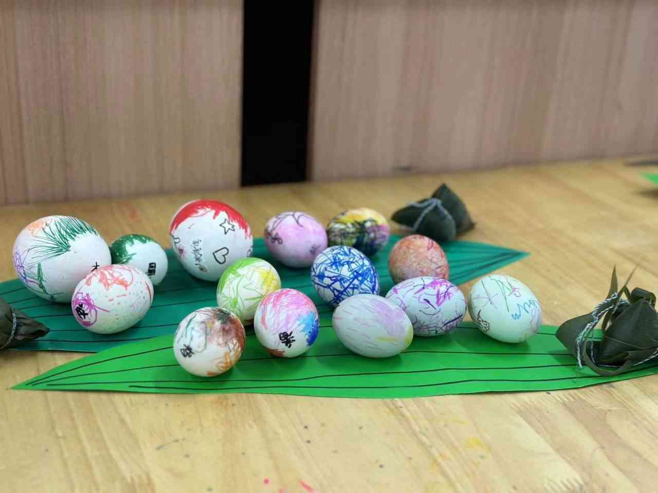 ~ 课堂上,老师们通过音视频、儿歌、绘本故事等让幼儿了解了端午节的来历和习俗,知道端午节是为了纪念爱国诗人屈原。孩子们看到老师播放的图片中有很多人的手腕上系着彩绳,十分好奇。看到孩子们好奇,老师们精心地为孩子们讲解了彩绳的寓意和制作过程,带领孩子们利用一双双巧手,亲手制作彩绳。在端午节画彩蛋寓意着“逢凶化吉,平平安安”。在老师的带领下,孩子们动起小手,把鸡蛋画得五彩斑斓,各具特色,并纷纷拿出自己的作品与同伴分享。另外,老师们还为孩子们们讲解了端午节吃粽子、插艾叶、佩戴香囊等习俗。在包粽子的环节中,孩子们小手拿着粽叶,一个个专注地包粽子。一折二盛三压实,四包紧五扎绳,在父母等长辈的帮助下,各具特色的粽子完成了。