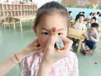 老师为孩子们点上朱砂,意为开启智慧,也寓意身体健康、平平安安。