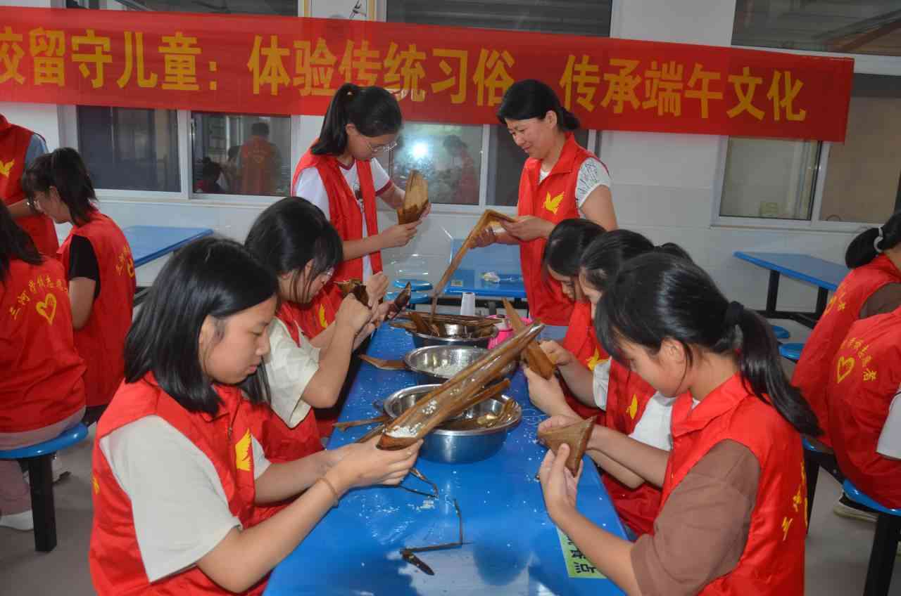 ~ 当天活动课,学校餐厅内,留守儿童之家管理员高保山给来自初中部的近二十名留守儿童简单介绍了端午节由来和吃粽子等习俗,引导孩子们认同中华文化,过好中国节。该校若干教师志愿者亲手演示、耐心讲解,孩子们兴致勃勃地学习包粽子。他们折粽叶、填馅料、包裹、捆扎,一遍又一遍,满脸的期望和坚韧。在老师们手把手指导下,一个个外形虽不怎么完美但饱含孩子们辛苦付出和美好愿景的粽子呈现在面前,孩子们开心的笑了。