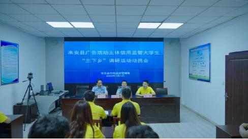 ~ 2023年7月1日,来安县市场监管局组织了“来安县广告活动主体信用监管大学生“三下乡”调研活动动员会”,会上市场监管局高继兵党组、吴孔明股长对来自滁州学院机电学院的大学生“三下乡”调研团队表示热烈欢迎;对新颁布的《管理办法》进行了说明;并对大学生调研团队提出了要求和期望。团队指导老师介绍了本次活动的主要目的、内容和计划安排,并对市场监管局给予本次实践活动的大力支持表示感谢。