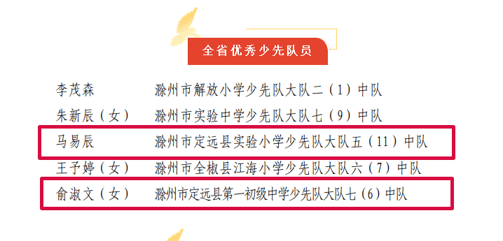 ~ 近日,2022年度安徽省“红领巾奖章”四星章、“优秀少先队员”、“优秀少先队辅导员”、“优秀少先队集体”主题宣传活动评选结果揭晓。定远县第一初中教育集团少先队员俞淑文同学获评“安徽省优秀少先队员”,少先队员刘译聪同学获评“红领巾奖章”四星章,集团团委副书记、少先队大队辅导员刘晓燕老师获评“安徽省优秀少先队辅导员”。