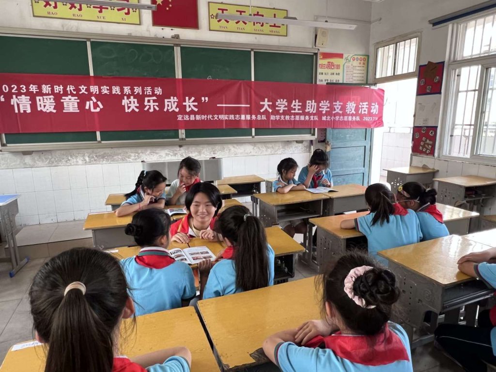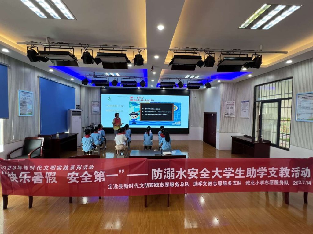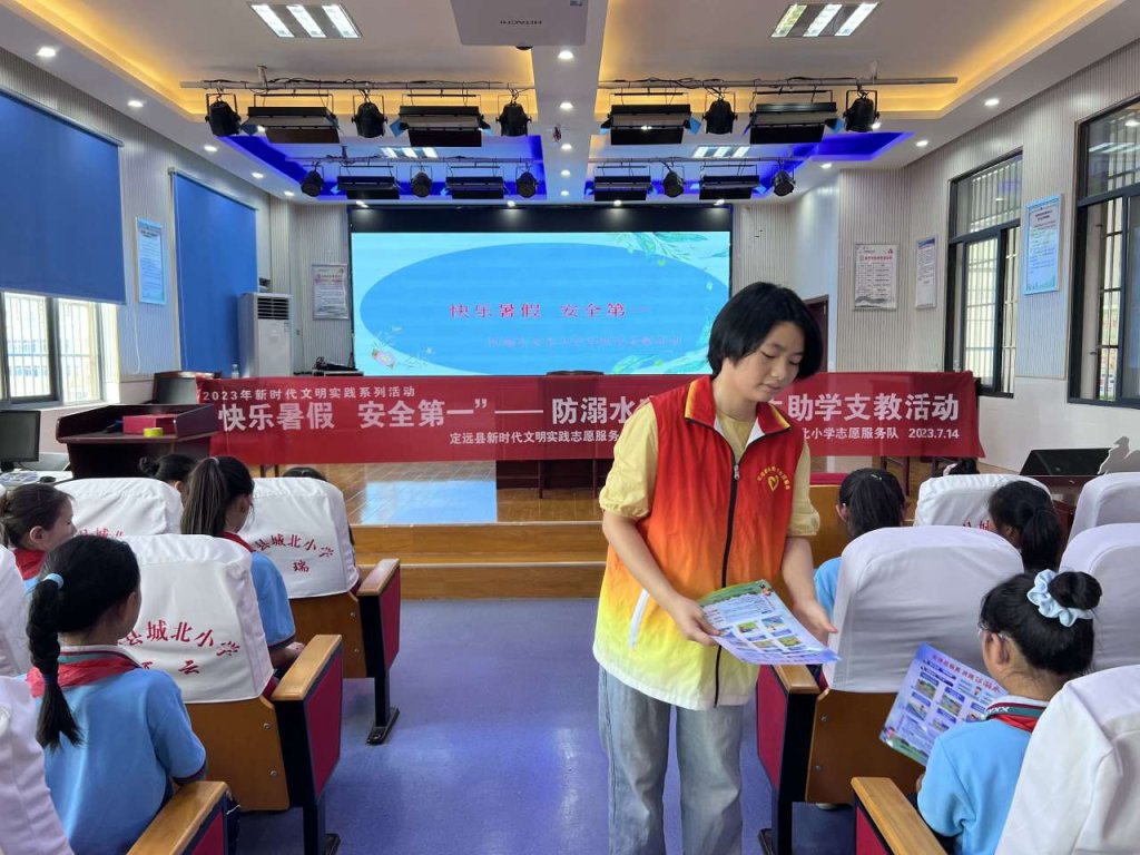~ 为加强未成年人思想道德建设,贯彻落实新时代文明实践系列活动,7月14日,定远县城北小学联合定远县新时代文明实践志愿服务总队、定远县助学支教志愿者服务支队,开展2023年大学生助学支教志愿服务活动。活动邀请了合肥某高校大二学生沈孔鑫同学,利用暑期为该校学生分别宣传定远市民文明手册知识、暑假防溺水安全知识,定远县城北小学选派部分留守儿童代表、贫困生代表、优秀少先队员代表参与培训学习。