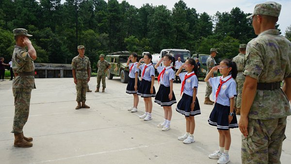 ~ 在部队驻地,慰问人员一行受到了部队官兵们的热烈欢迎。由战士引路,慰问人员一行参观了部队营区和战士的内务,叠成豆腐块状的被子,摆在一条直线上的牙刷,引来了师生们的阵阵赞叹,近距离感受了人民军队严明的纪律和优良的作风。训练场上,师生们观看了战士们气势如虹的军体拳展示和娴熟的单兵武器的分解和组装操作,并为官兵们过硬的军事素质所深深折服。由教官领唱,师生们带着高涨的热情集体高唱《强军战歌》,沉浸式体验了火热的军旅生活。