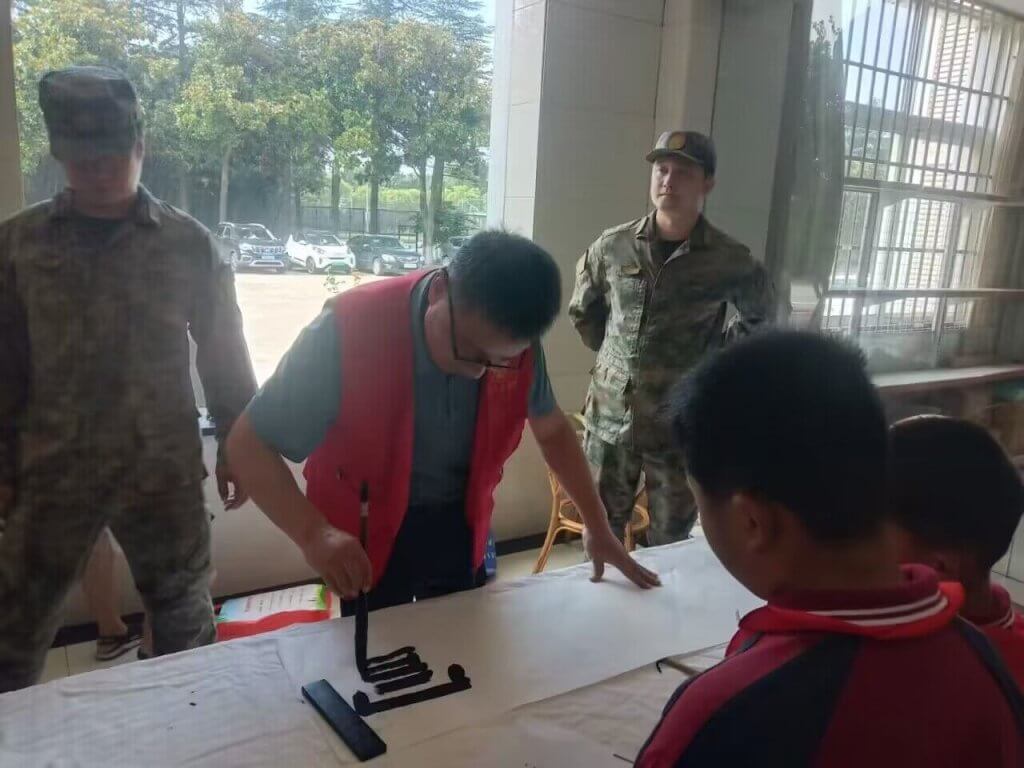 ~ 活动中,随行的该校县书法家协会会员冯立章老师当堂泼墨挥毫“军民团结”,庆祝官兵们的节日。在工作人员的引领下,师生们一起观看了汽车试验场宣传片,参观了各种装备车型,现场观看了环形跑道试车,聆听试车员详细介绍各种车型特点……