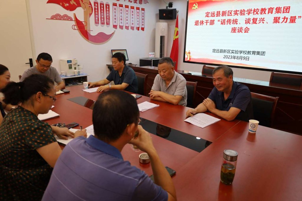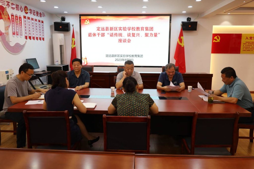 8月9日,定远县新区实验学校教育集团在新区实小校区党建室召开退休干部“话传统、谈复兴、聚力量”座谈会。学校领导班子及退休干部代表参加了座谈。