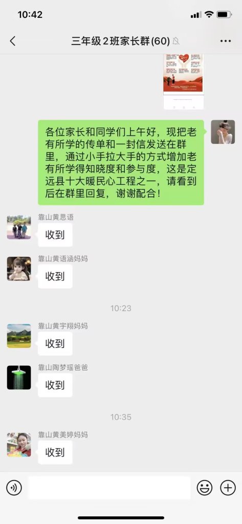 ~ 近日,该校通过学校电子显示屏宣传老有所学,利用防溺水上门的机会向老年人宣传老有所学的相关政策,同时组织各班班主任通过班级微信群向学生推送宣传册页和一封信内容向他们普及“暖民心行动”政策,通过小手拉大手,引导学生向家中老人宣传老有所学的相关政策及内容,也让同学们更加珍惜现在的幸福生活,养成尊老敬老的传统美德,发挥家庭在助老中的作用。