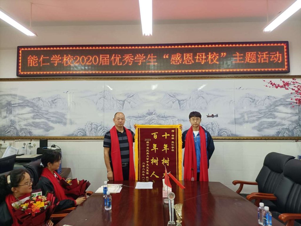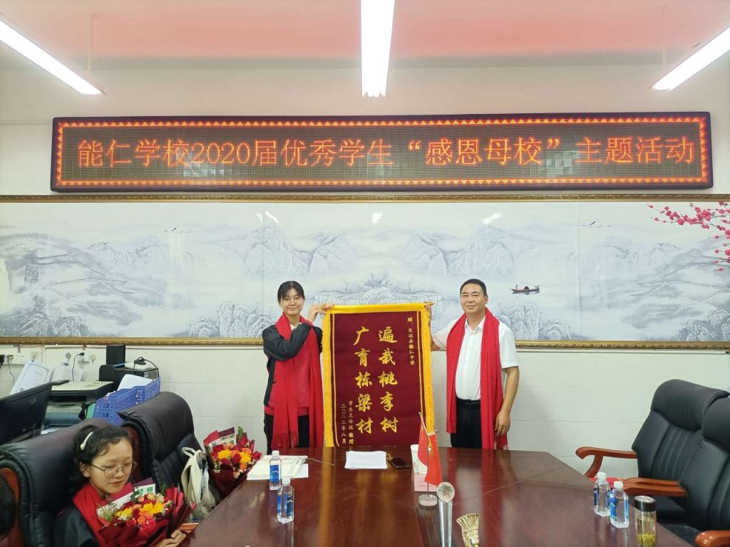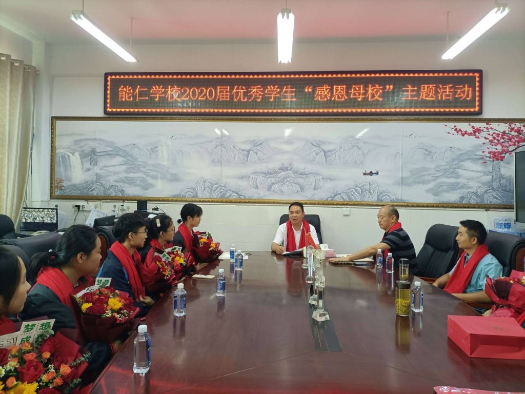 ~ 能仁学校校长张中保热情接待了优秀学子一行,用鲜花表达了对他们的祝贺。座谈会上,张校长介绍了能仁学校近年来的教育教学情况及取得的成绩。告诉学子们到了高等学府更要刻苦学习,奋发向上,早日成为国家栋梁,为祖国建设做出贡献,为母校增光添彩!