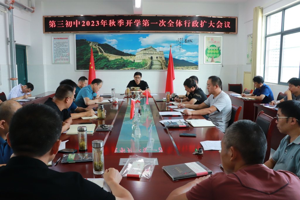 ~ 为及时谋划学校发展思路,全方位筹备开学工作,8月23日,定远县第三初级中学召开2023年秋季开学第一次行政扩大会议。会议由该校党支部书记、校长吴传东主持,全体行政人员、年级负责人参加了会议。