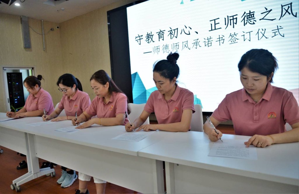 ~ 党支部副书记陈虹对全体教职工进行师德师风教育,带领大家重温《新时代幼儿园教师职业行为十项准则》,并采用案例分析的方式对师德师风建设提出了新要求,强调教师要恪守为师之本,筑牢思想防线,树立良好形象。金俊园长与各分园执行园长现场签订师德师风承诺书,落实责任到人。