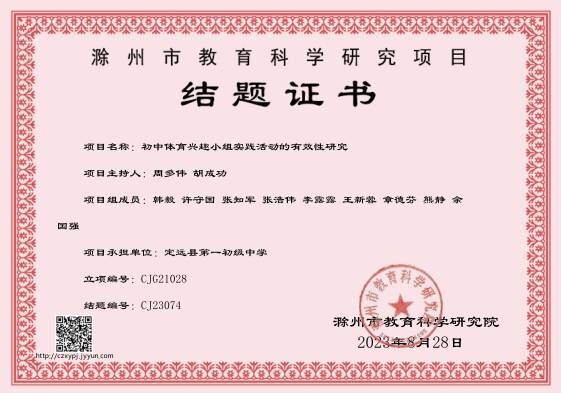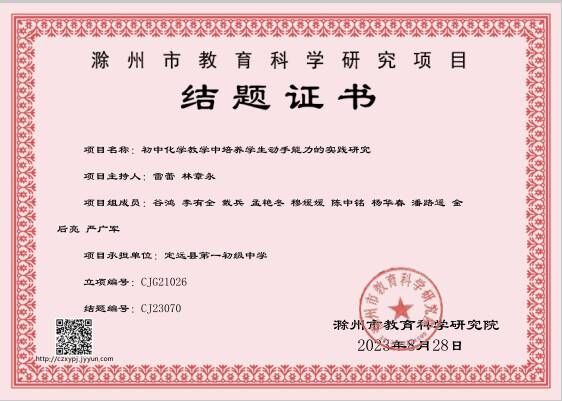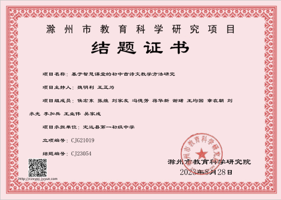 ~ 8月28日,滁州市教育科学研究院传来好消息,定远县第一初中四个市级课题成功结题。