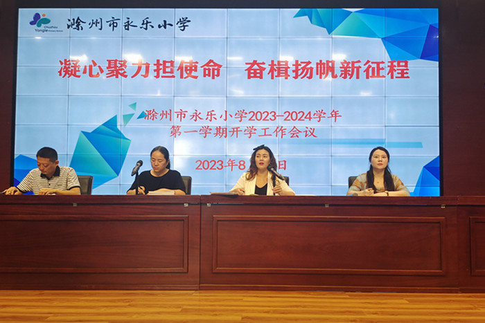 ~ 征程万里风正劲,求真务实开新局。为进一步凝聚共识统一思想,切实做好开学准备工作,8月31日,滁州市永乐小学在“童乐谷”剧场,召开了2023-2024学年第一学期全体教师开学工作会议,会议围绕“凝心聚力担使命 奋楫扬帆新征程”这一主题,统筹安排了新学期相关工作,引领大家以饱满的精神、积极的态度迎接新学期各项工作。