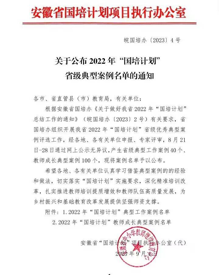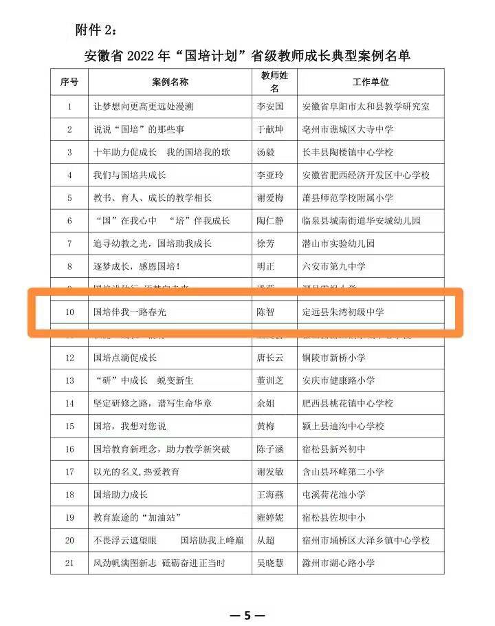 ~ 定远县朱湾初中陈智老师的国培典型案例《国培伴我一路春光》成功入选安徽省2022年“国培计划”省级教师成长典型案例。