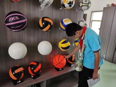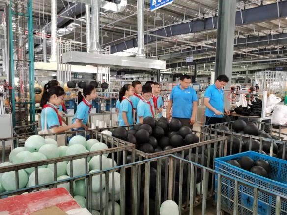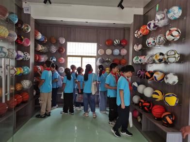 ~ 接着,李经理又带着一行人来到公司生产车间的二楼,顺着球类生产流水线路线,耐心详细讲解着每道生产工序过程及注意事项。期间,在设计打印球体图案和为球体刷胶两个环节,李经理让同学们动手操作,亲身体验设计生产过程。随后,李经理将师生们带到公司球类展示厅,介绍了公司的规模及发展前瞻。