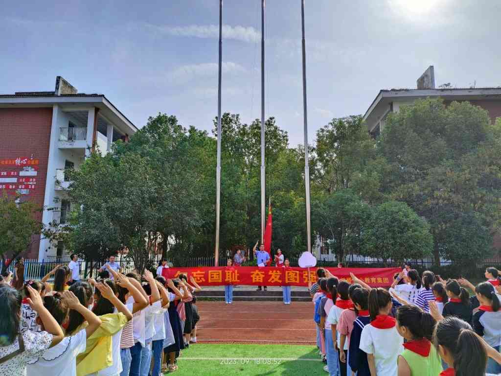 ~ 在雄壮的国歌声中,五星红旗冉冉升起,大家肃立行礼,齐唱国歌。少先队辅导员吴永亮老师引领大家回顾了“九一八事变”的历史过程,呼吁全体同学铭记历史、勿忘国耻、奋发学习,为建设和保卫祖国贡献自己的力量。