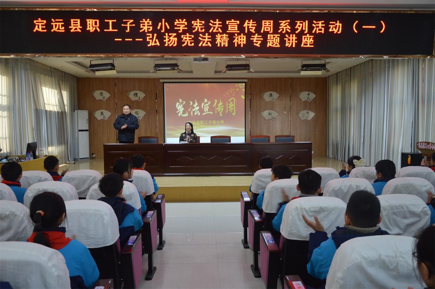 在推普周活动中,学校成立专门领导小组,紧紧围绕活动主题,利用国旗下讲话向全校师生宣传推广普通话和标准字的必要性,并发出倡议;利用电子屏幕、黑板报、宣传栏和主题班会进行专题宣传,引导学生形成“人人说好普通话,人人写好规范字”的浓厚氛围。活动期间,学校教导处组织了规范汉字书写和经典诵读比赛活动,并将评选出的优秀作品和优秀选手在校园内展示宣传,增强了学生说好普通话的意识。